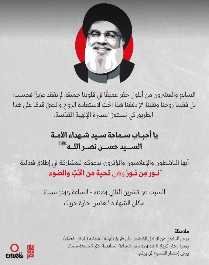 يعتزم حزب الله، اليوم، إقامة مراسم تأبين للأمين العام السابق الشهيد السيد حسن نصرالله، الذي إستشهد بغارة جوية إسرائيلية في 27 أيلول الماضي.