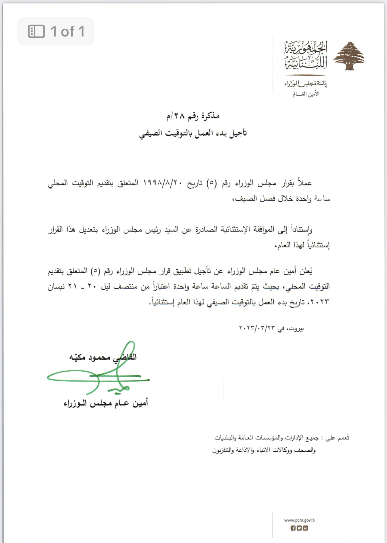“عملاً بقرار مجلس الوزراء رقم (5) تاريخ 20/8/1998 المتعلق بتقديم التوقيت المحلي ساعة واحدة خلال فصل الصيف، وإستناداً إلى الموافقة الإستثنائية الصادرة عن السيد رئيس مجلس الوزراء بتعديل هذا القرار إستثنائياً لهذا العام، يُعلن أمين عام مجلس الوزراء عن تأجيل تطبيق قرار مجلس الوزراء رقم (5) المتعلق بتقديم التوقيت المحلي، بحيث يتمّ تقديم الساعة ساعة واحدة اعتباراً من منتصف ليل 20 ــــ 21 نيسان 2023، تاريخ بدء العمل بالتوقيت الصيفي لهذا العام إستثنائياً”.