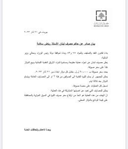 يُعلن مصرف لبنان عن إجراء عملية مفتوحة ومستمرّة لشراء الأوراق النقديّة اللبنانيّة وبيع الدولار نقداً على سعر “صيرفة”، ويُحدّد بـ90 ألف ليرة مقابل كلّ دولار ابتداءً من تاريخ اليوم.