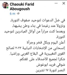 بدا ملفتاً انسحاب المرشح عن المقعد الدرزي في راشيا شوقي أبو غوش عن لائحة الكتائب لصالح القوى التغييرية في البقاع الغربي – راشيا الذي لاقى ترحيباً من مجموعات الثورة في المنطقة.