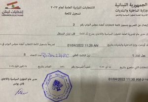 تم اليوم تسجيل لائحة “قلب لبنان المستقل” المكتملة عن دائرة جبل لبنان الاولى اي كسروان – الفتوح وجبيل في وزارة الداخلية والبلديات بمرشحيها الثمانية وهم: