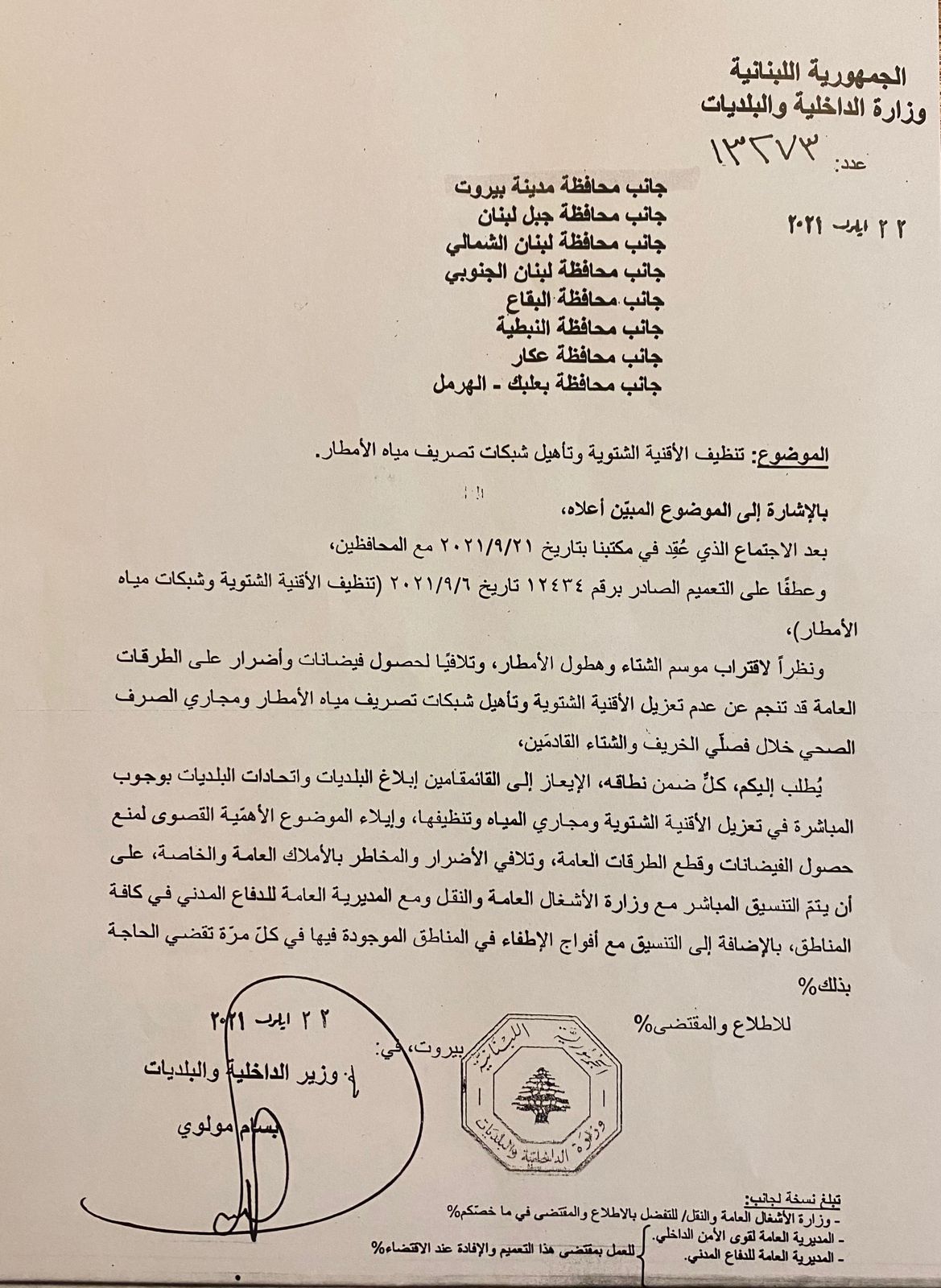 أصدر وزير الداخلية والبلديات القاضي بسام مولوي تعميما الى المحافظين، طالبا منهم الايعاز الى القائمقامين ابلاغ البلديات واتحادات البلديات بوجوب المباشرة في تعزيل الاقنية الشتوية ومجاري المياه وتنظيفها، وإيلاء الموضوع الأهمية القصوى لمنع حصول الفيضانات وقطع الطرقات العامة، وتلافي الأضرار والمخاطر بالأملاك العامة والخاصة.