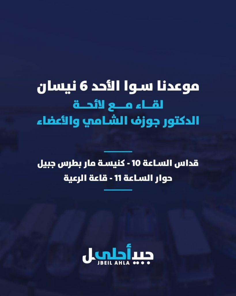 علم موقع”قضاء جبيل”أَنَّ لقاءً سيعقد غَدًا في الحادية عشرة من قبل الظهر في قاعة كنيسة مار بطرس جبيل للائِحَة الدكتور جوزف الشامي المدعومة من النائب زياد الحواط، بِحضور أعضاء اللائحة. وَيَتَخَل اللقاء حوار مع الاعضاء والحاضرين ويسبقه قداس في الكنيسة.