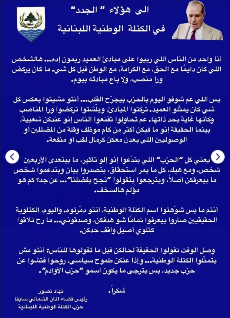 وفي بيان نشره نصور، استعاد فيه إرث العميد ريمون إده، قائلاً: أنا واحد من الناس اللي ربيوا على مبادئ العميد ريمون إده… ها الشخص اللي كان دايمًا مع الحق، مع الكرامة، مع الوطن قبل كل شي، ما كان يركض ورا منصب ولا باع مبادئه بيوم.