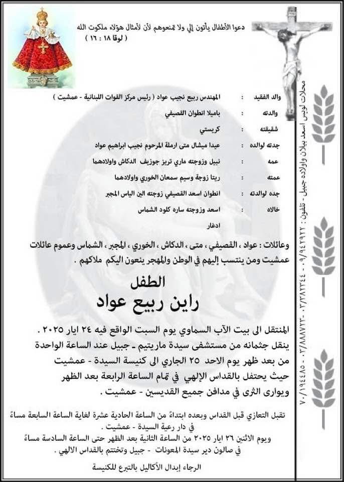 علم موقع “قضاء جبيل” أن الطفل راين ربيع عواد، ابن رئيس مركز القوات اللبنانية في عمشيت المهندس ربيع نجيب عواد، قد توفي غرقًا في إحدى أحواض السباحة.