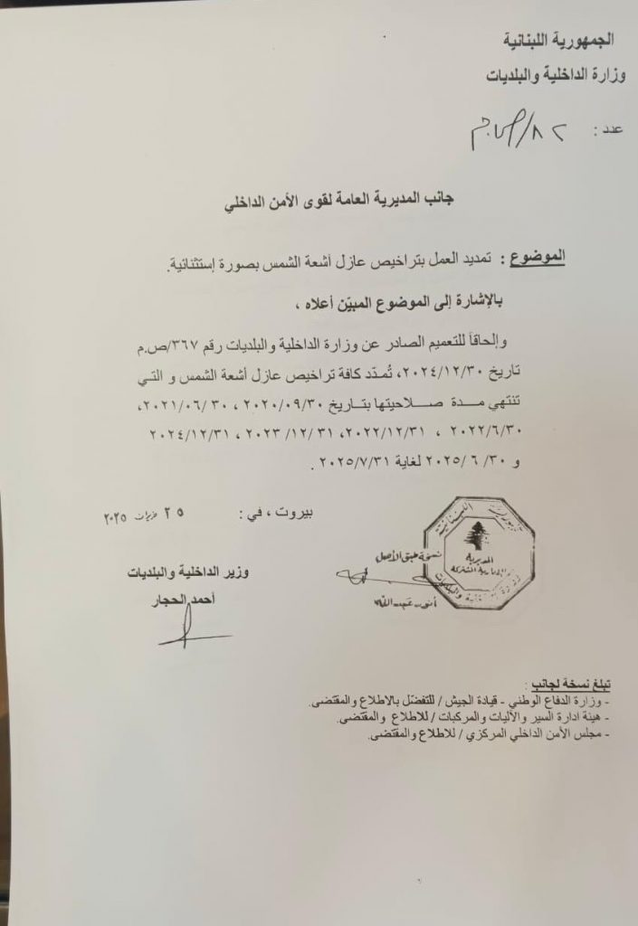 أعلن وزير الداخلية والبلديات أحمد الحجار، في تعميم ، تمديد العمل بتراخيص عازل أشعة الشمس على السيارات بصورة استثنائية حتى تاريخ ٢٠٢٥/٧/٣١