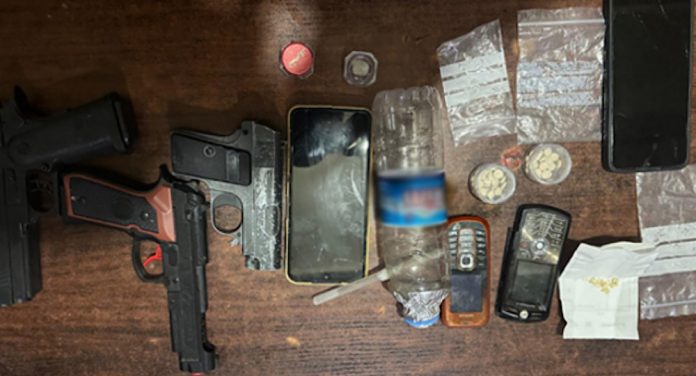 وبتفتيشهما، تم ضبط / ٤ / هواتف خلوية، مسدسان بلاستيكيان ومسدس معدني صغير الحجم، تُستخدم في عمليات النشل والسلب وكمية من المواد المخدّرة موزّعة على الشكل التالي: