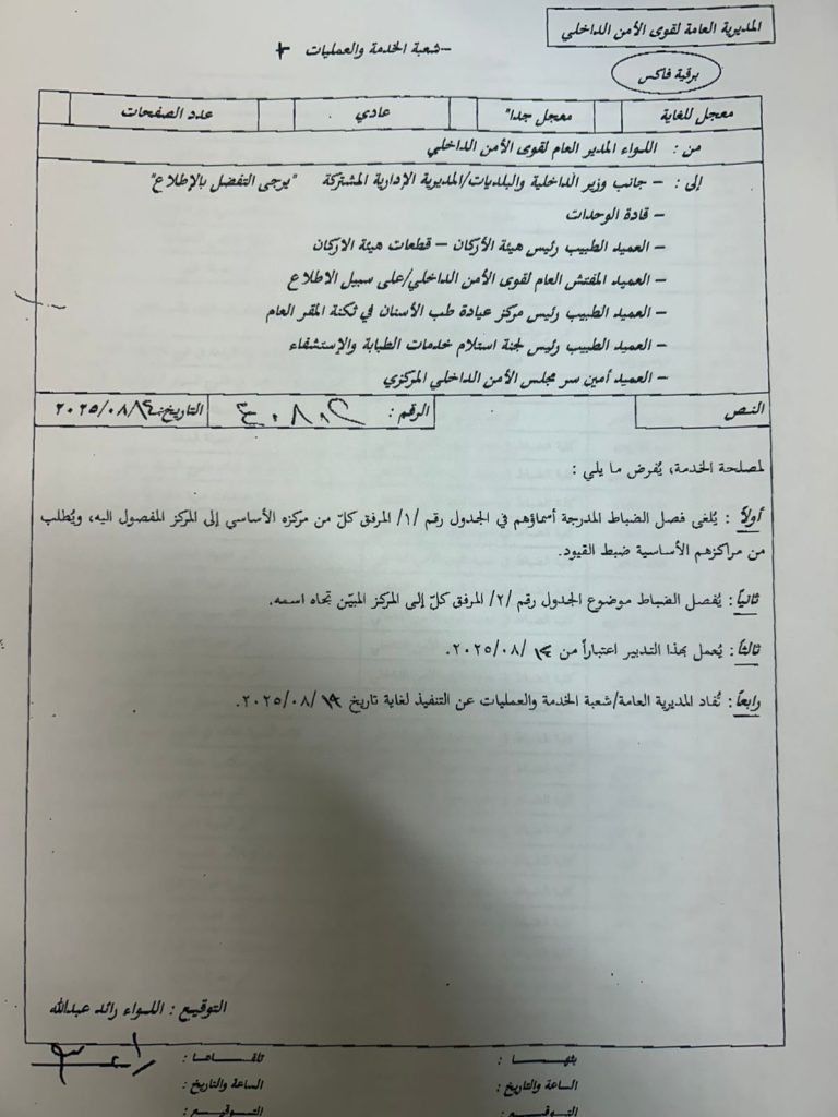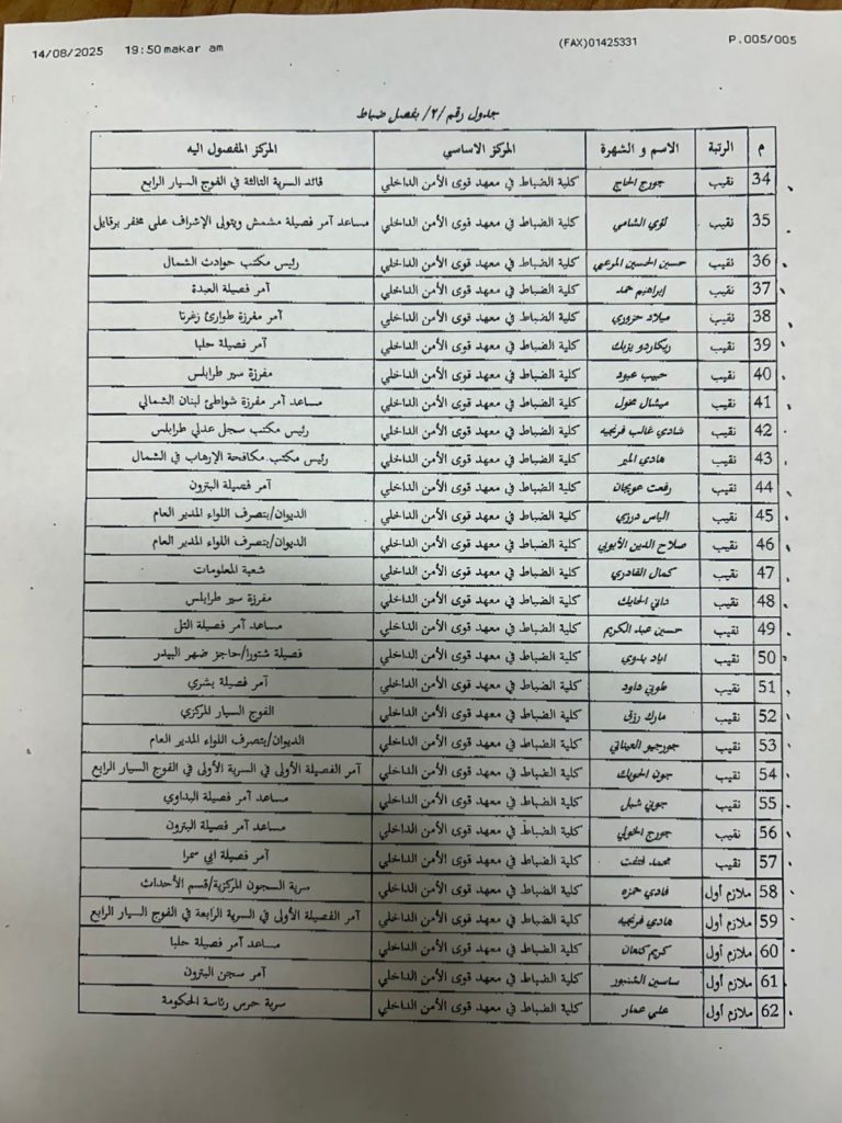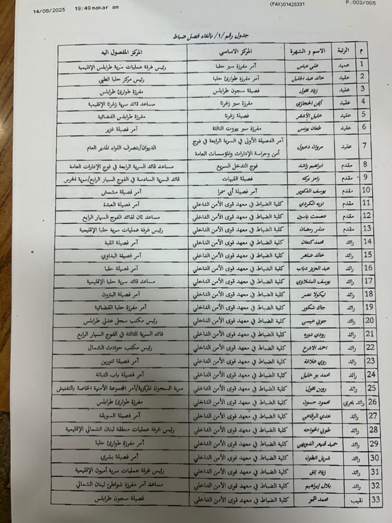 أصدر المدير العام لقوى الأمن الداخلي اللواء رائد عبدالله، برقية قضت بإلغاء فصل عدد من الضباط من مراكزهم الأساسية، ونقلهم إلى مراكز جديدة، وذلك “لمصلحة الخدمة”،