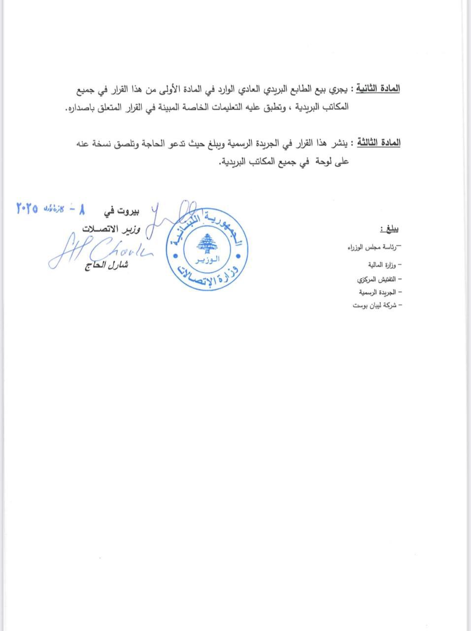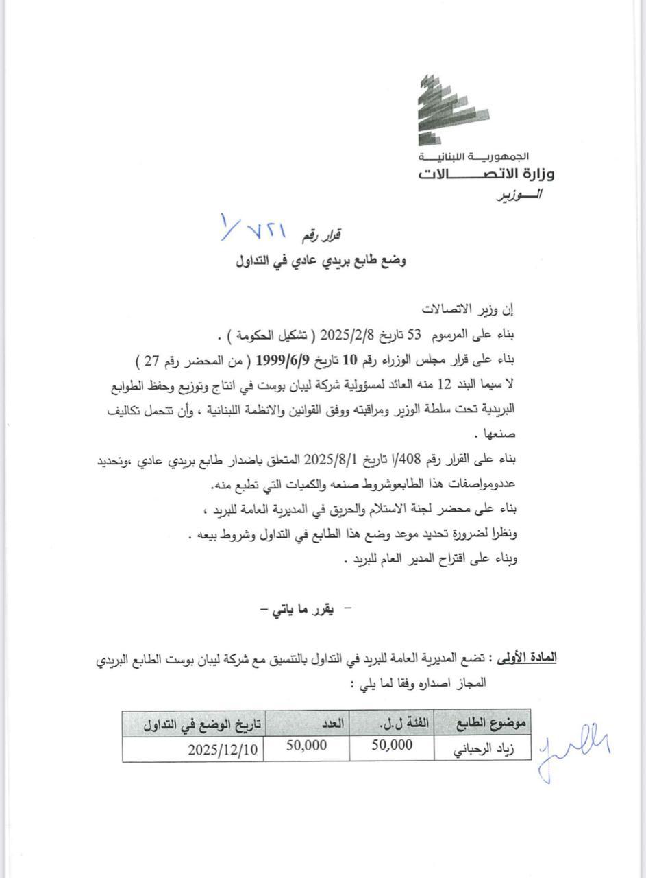 أبرز العناوينطابع جديد باسم زياد الرحباني محلياتطابع جديد باسم زياد الرحباني17:20 2025 ,December 8086 أصدر وزير الاتصالات شارل الحاج، قراراً بوضع طابع بريدي جديد يحمل صورة زياد الرحباني في التداول، فئة 50 ألف ليرة وبعدد 50 ألف نسخة، ابتداءً من 10 كانون الأول 2025. FacebookTwitterPinterestWhatsAppTelegram الخبر السابقالحواط: رئيس لجنة الدفاع يمتنع عن إدراج مشروع تعديل قانون الإنتخابالخبر التاليخاص-التيار في بلدية جبيل- إعلان - - إعلان - - إعلانات - - إعلانات - الأكثر قراءةمأساة مؤلمة… ميشال جثّة داخل منزله! 11:38 2025 ,December 4 أوَّل معجزة تُسَجَّل بعد زيارة البابا ضريح مار شربل: رَنَّ هاتف الطبيب وصوتُ القديس يُعلِنُ الأعجوبة 15:24 2025 ,December 4 جريمة مروّعة نفّذها سوريّان… ودعوات لضبط النفس 12:02 2025 ,December 4 خاص-منشور للزميل عبدو متى يثير الجدل حول حضور سليم صفير لقاء الشبيبة في بكركي! 23:24 2025 ,December 1 المزيد- إعلانات - - إعلانات - - إعلان - - إعلان -