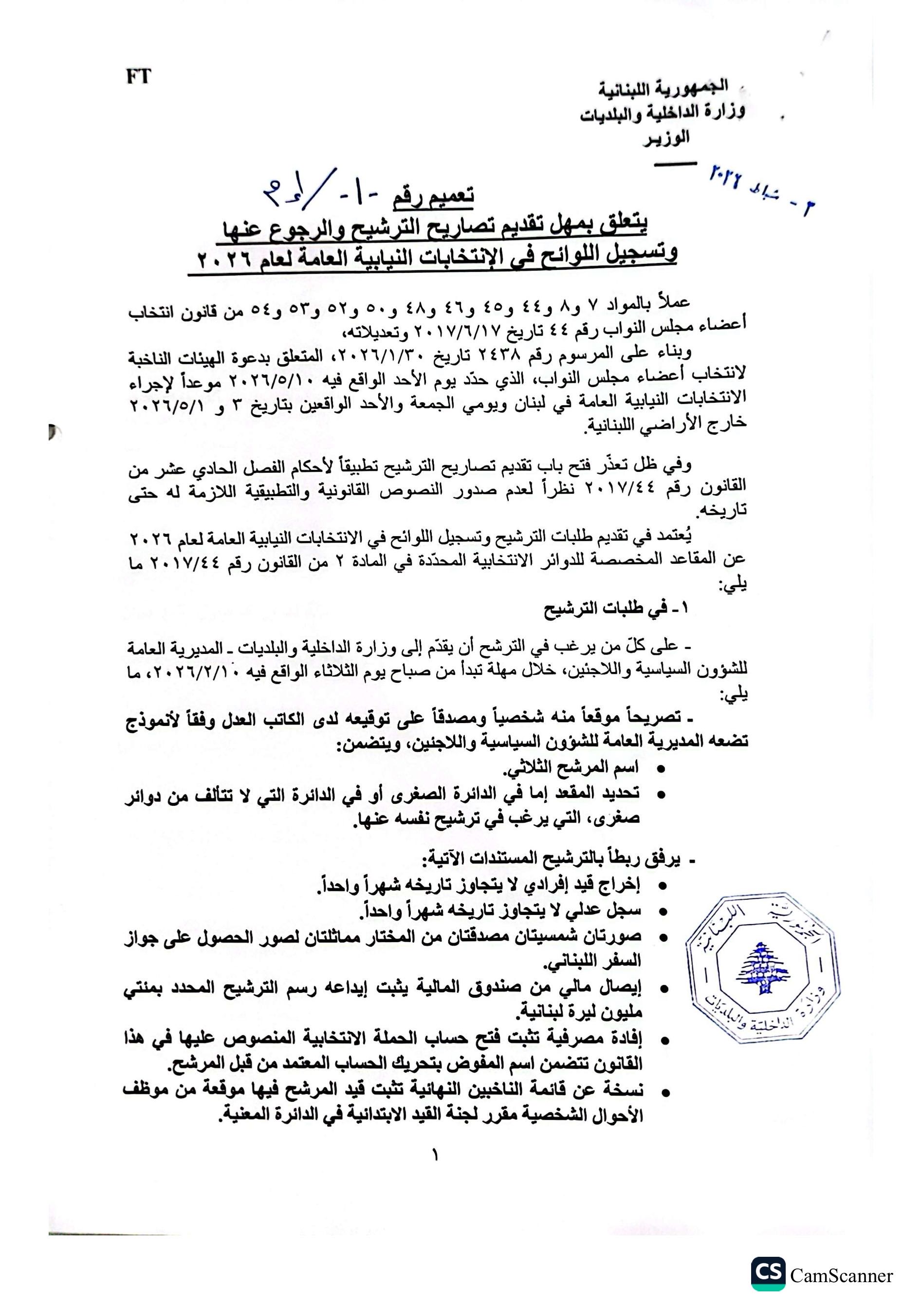 وبحسب التعميم، تبدأ مهلة تقديم تصاريح الترشيح لدى وزارة الداخلية والبلديات – المديرية العامة للشؤون السياسية واللاجئين، اعتباراً من صباح يوم الثلاثاء في 10 شباط 2026، وتستمر حتى الساعة 24:00 من يوم الثلاثاء 10 آذار 2026.