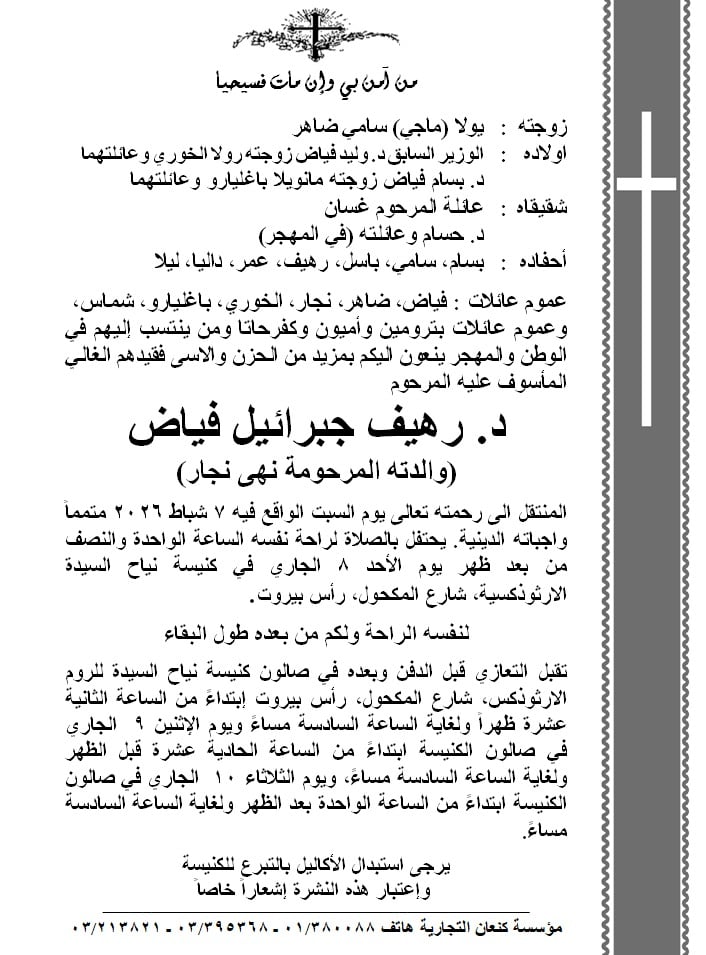 غيب الموت اليوم السيت 7 شباط 2026 ، الدكتور رهيف جبرائيل فياض والد وزير الطاقة والمياه الاسبق وليد فياض، وسط أجواء من الحزن خيّمت على العائلة والأقارب.