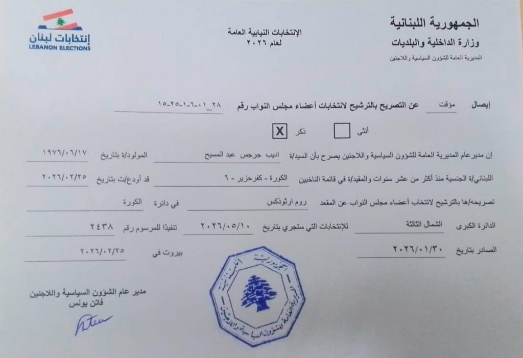 تقدّم النائب اديب عبد المسيح بأوراق ترشحه للانتخابات النيابية في المديرية العامة للشؤون السياسية، مستكملاً بذلك الإجراءات القانونية للمشاركة في الاستحقاق المرتقب.