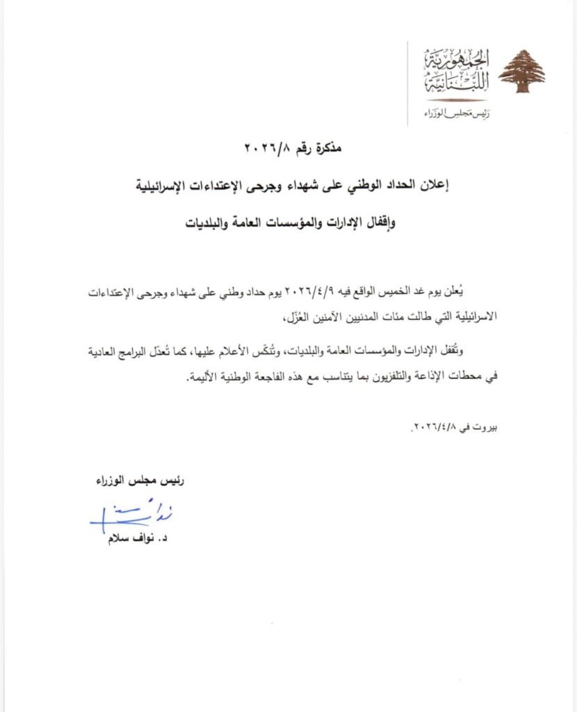 اعلن رئيس مجلس الوزراء الدكتور نواف سلام يوم غد الخميس الواقع فيه ٢٠٢٦/٤/٩ يوم حداد وطني على شهداء وجرحى الاعتداءات الإسرائيلية التي طالت مئات المدنيين الآمنين العُزل، كما اعلن إقفال الإدارات والمؤسسات العامة والبلديات في هذا اليوم وتنكيس الأعلام عليها وتعديل البرامج العادية في محطات الإذاعة والتلفزيون بما يتناسب مع هذه الفاجعة الوطنية الأليمة.