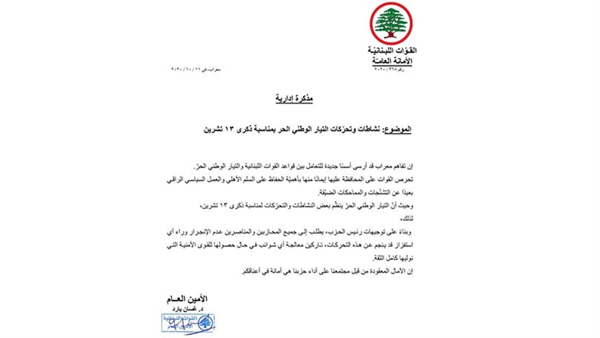 ولفت يادر في المذكّرة الى أنّ التيّار الوطني الحر ينظّم بعض النشاطات والتحرّكات لمناسبة ذكرى 13 تشرين، ولذلك “وبناءً على توجيهات رئيس الحزب”، يطلب “عدم الانجرار وراء أيّ استفزاز قد ينجم عن هذه التحرّكات تاركين معالجة أيّ شوائب في حال حصولها للقوى الأمنيّة التي نوليها كامل الثقة”.