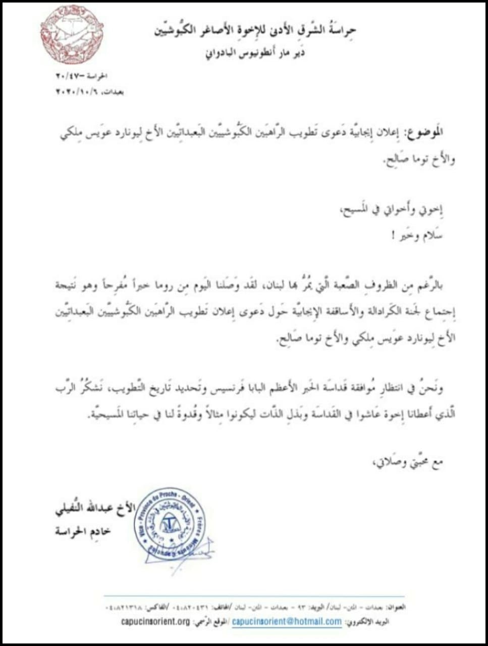 في سياق متصل، كتب الأب طوني فريحة الكبّوشي عبر الفيسبوك: “تفرح كنيسة لبنان والرهبنة الكبّوشيّة بنتيجة اجتماع الكرادلة والأساقفة في مجمع دعاوى القديسين وهي قبول دعوى تطويب الأبوَيْن الشهيدين الكبّوشيّين ليونارد ملكي وتوما صالح، وتمّ التصويت إيجابًا ما يعني أننا نبقى في انتظار القرار النهائي للبابا وتحديد تاريخ التطويب. هللويا!