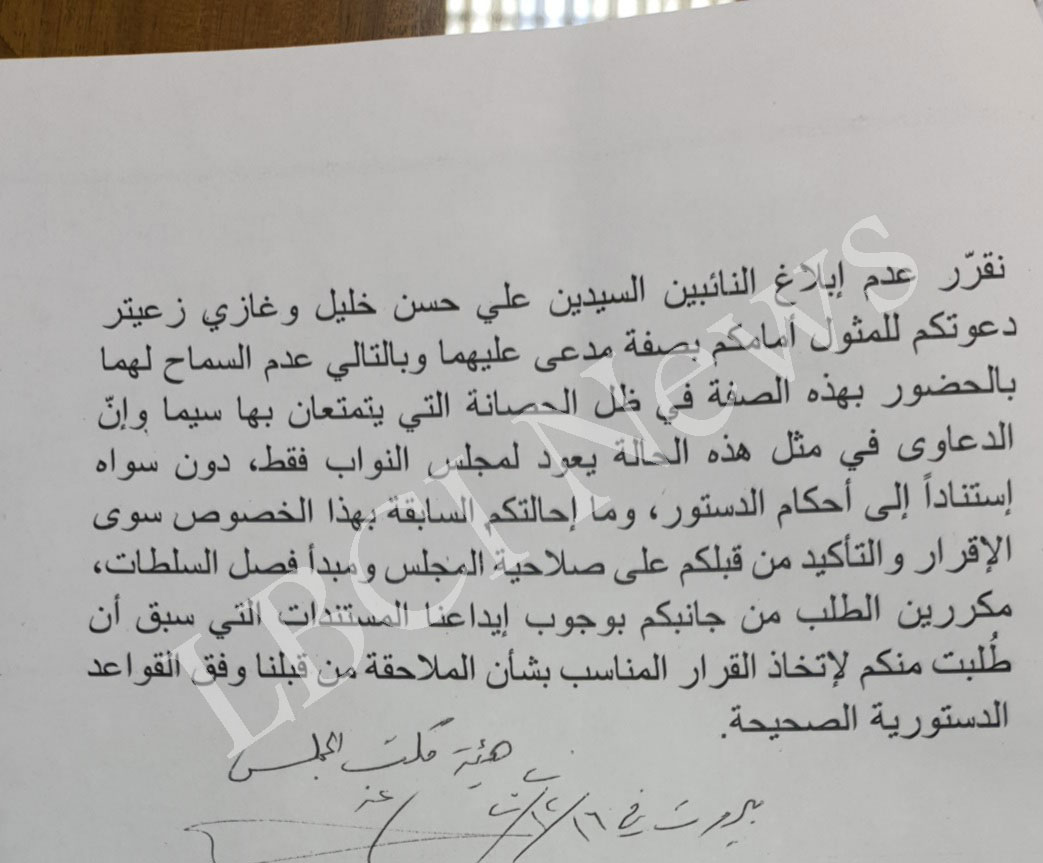 الى ذلك، حصلت الـLBCI على قرار هيئة مكتب مجلس النواب القاضي بعدم إبلاغ النائبين علي حسن خليل وغازي زعيتر دعوة المحقق العدلي فادي صوان للمثول امامه بصفة مدعى عليهما في قضية انفجار مرفأ بيروت.