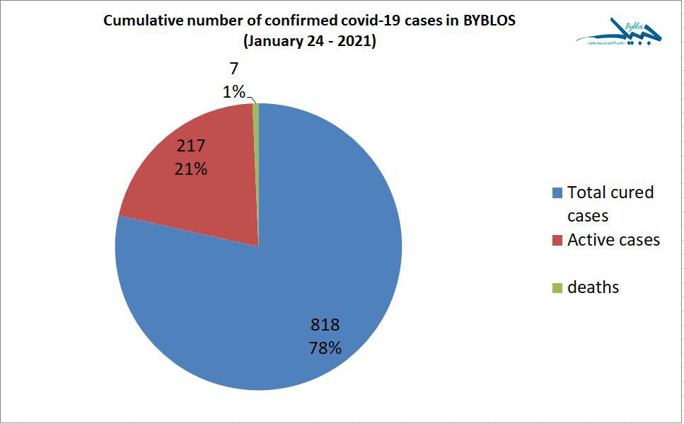 أعلنت بلدية جبيل -بيبلوس ان المدينة سجلت منذ العام ٢٠٢٠ لغاية اليوم، ١٠٤٢ حالة ايجابية بفيروس كورونا، ٧ منهم حالات وفاة، ٨١٨ منهم شفاء تام، و٢١٧ شخص لا تزال حالتهم ايجابيّة.