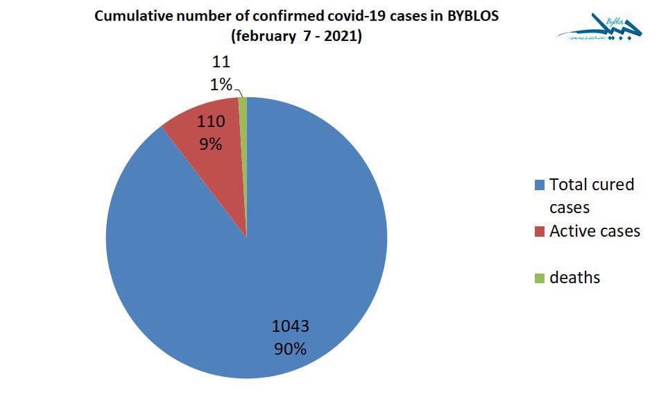 سجلّت مدينة جبيل منذ بداية انتشار فيروس كورونا لغاية تاريخ ٧ شباط ٢٠٢١، ١١٦٤ حالة ايجابية، ١١ منهم حالات وفاة، ١٠٤٣ منهم شفاء تام، و١١٠ شخص لا تزال حالتهم ايجابيّة بحسب ما أعلنت بلدية جبيل-بيبلوس .