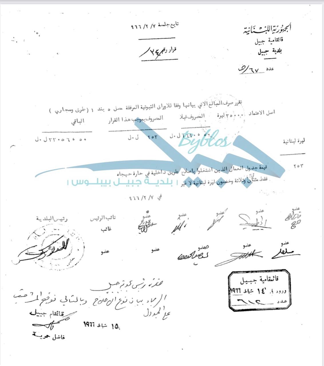 وتقدّم البلديّة خدمات كثيرة من خلال المعاملات اليومية مع المواطنين ومع الدوائر الحكومية مما ينتج عن ذلك كميات كبيرة جداً من الوثائق الورقيّة، وحيث أن هذه المجموعات من الوثائق الورقية تحمل رصيداً ثميناً من المعلومات الحيوية بالنسبة للدائرة وللمتعاملين معها وبالنسبة لتاريخ جبيل، فإن البلدية تولي الوثائق الأهمية القصوى إذ أنّه يوجد في أرشيفها العقاري معاملات منذ العام ١٩٣٢ وأرشيف مقررات المجلس البلدي منذ العام ١٩٠٣.