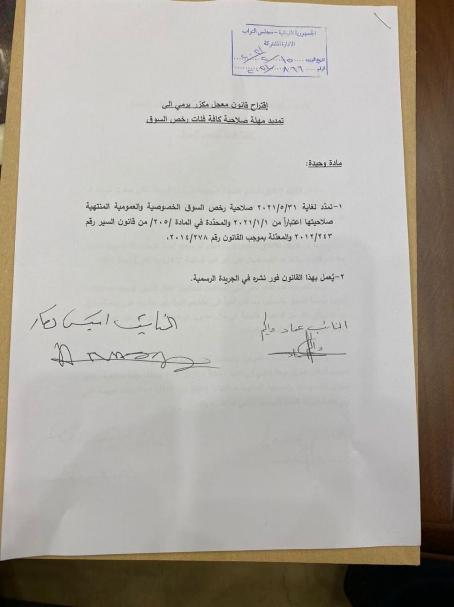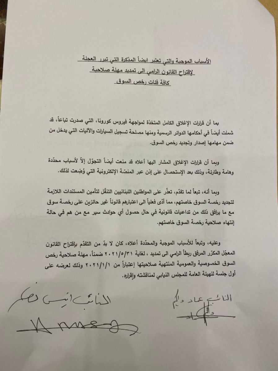 تقدم عضوا تكتل الجمهورية القوية، النائبان عماد واكيم وأنيس نصار، باقتراح قانون معجل مكرر يهدف إلى “تمديد مهلة العمل برخص السوق الخصوصية والعمومية التي انتهت صلاحيتها لكون قرارات الاغلاق الكامل المتخذة لموجهة فيروس كورونا شملت مصلحة تسجيل السيارات. وعليه تعذّر على المواطنين التنقل لتأمين المستندات اللازمة لتجديد رخص السوق المنتهية صلاحيتها ما حال دون إمكانية تجديدها”.