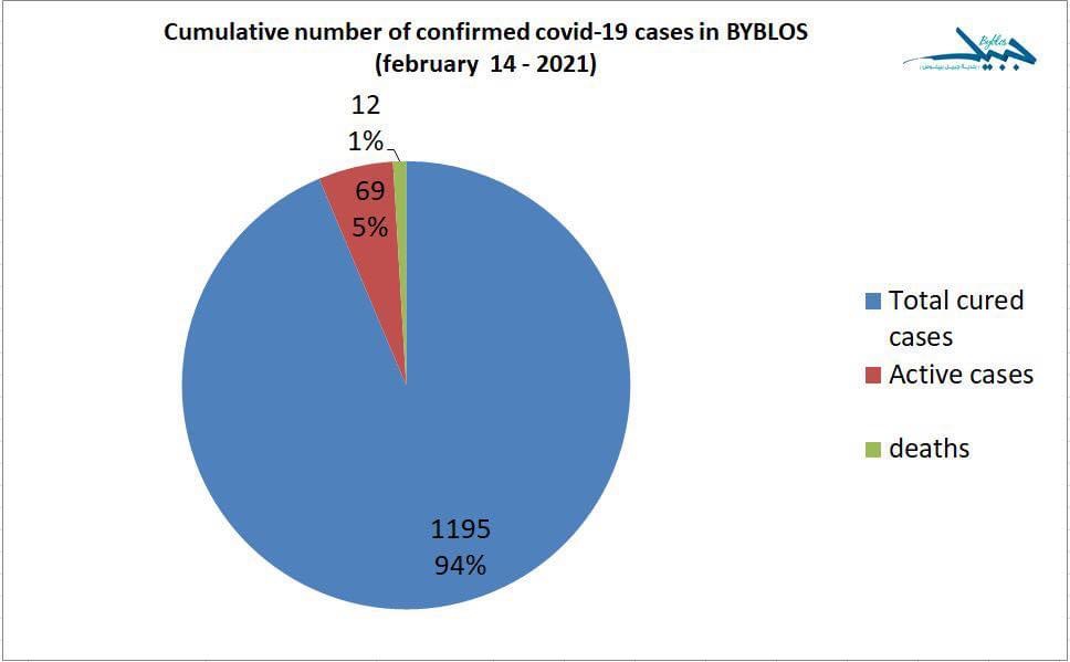 سجلّت مدينة جبيل منذ بداية انتشار فيروس كورونا لغاية تاريخ ٢٢ شباط ٢٠٢١، ١١٩٥ حالة شفاء ، ١٢ حالة وفاة، و٦٩ شخص لا تزال حالتهم ايجابيّة بحسب ما أعلنت بلدية جبيل -بيبلوس.