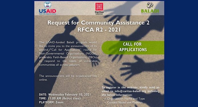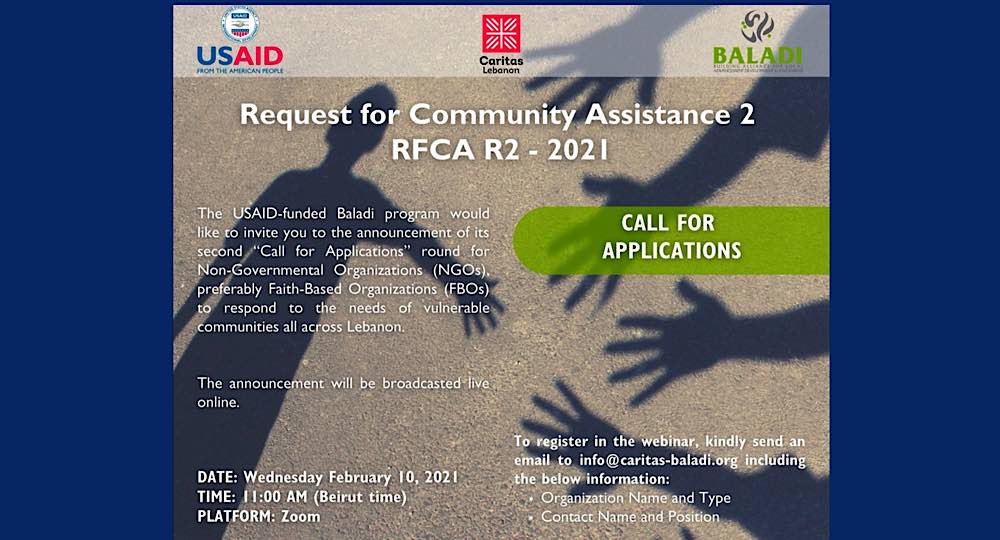 نظم برنامج بناء التحالفات من أجل التقدم المحلي والتنمية والاستثمار (بلدي)، المموّل من الوكالة لأميركية للتنمية الدولية (USAID) والمنفذ من قبل رابطة كاريتاس لبنان، في ١٠ شباط الحالي، ندوة عبر الإنترنت، أطلق من خلالها مشروع طلب منح (RFCA R2 2021) من قبل المنظمات الغير حكومية وذات الطابع الديني، من أجل مساعدة المجتمعات الفقيرة والضعيفة.