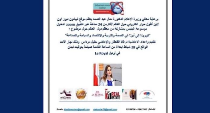 تفتتح وزيرة الاعلام في حكومة تصريف الاعمال الدكتورة منال عبد الصمد نجد، عبر تطبيق Zoom ، مباراة عن أطول حوار الكتروني، بعنوان “كورونا الى اين؟”، من تنظيم الاعلامي خليل مرداس والدكتورة علا القنطار، يوم الاحد المقبل في 28 الحالي بدءا من الثامنة صباحا.