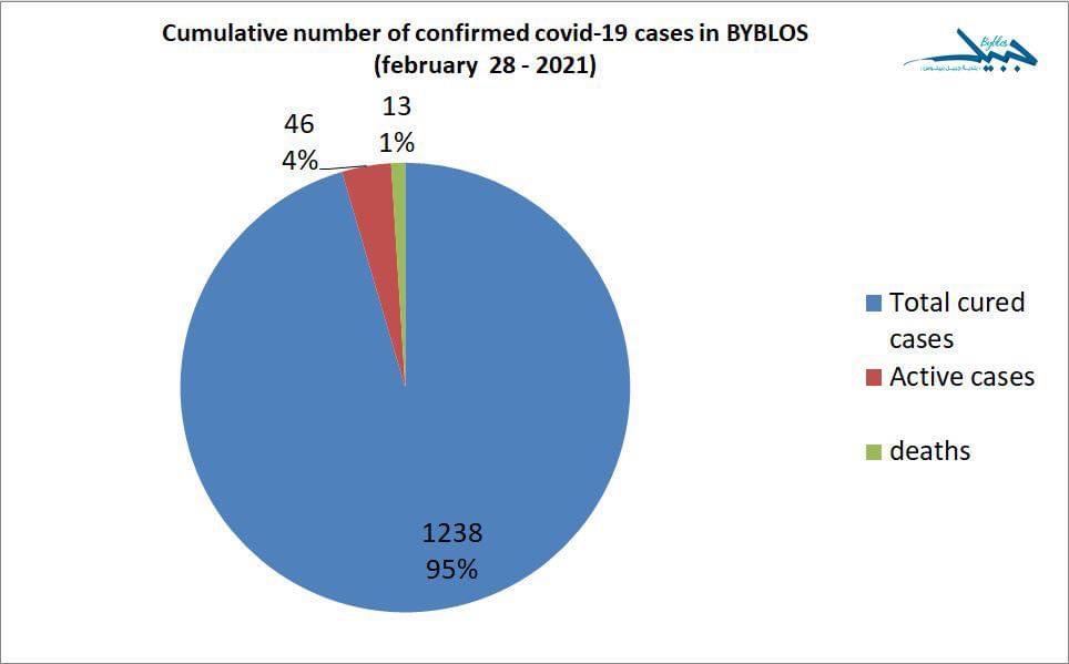 سجلّت مدينة جبيل منذ بداية انتشار فيروس كورونا لغاية تاريخ ٢٨ شباط ٢٠٢١، ١٢٩٧ حالة ايجابية، ١٣ منهم حالات وفاة، ١٢٣٨ منهم شفاء تام، و٤٦ شخص لا تزال حالتهم ايجابيّة بحسب ما أعلنت بلدية جبيل -بيبلوس