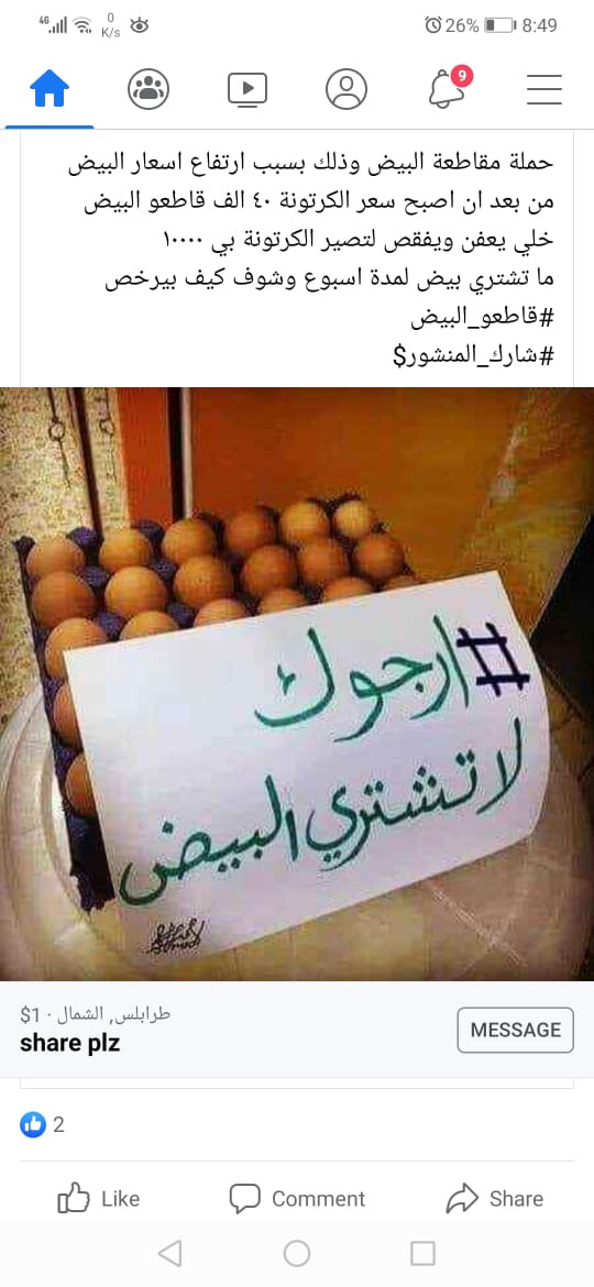 محلياتكرتونة البيض بـ40000 ليرة.. وحملة لمقاطعته آخر الأخباركرتونة البيض بـ40000 ليرة.. وحملة لمقاطعته10:58 2021 ,March 230870 انتشرت عبر مواقع التواصل الاجتماعي حملة دعت لمقاطعة شراء البيض بسبب ارتفاع سعره حيث أصبحت الكرتونة بـ40000 ليرة.وجاء في اعلان الحملة: “قاطعوا البيض خلي يعفن لتصير الكرتونة بـ10000. ما تشتري بيض لمدة أسبوع وشوف كيف بيرخص”. FacebookTwitterPinterestWhatsAppTelegram الخبر السابقانطلاقة نارية للدولار صباح اليومالخبر التالي“كهرباء لبنان”: سقوط برج توتّر عالي بسبب سرقة زوايا التشبيك- إعلان - - إعلان - ترك الردالتعليق:من فضلك ادخل تعليقك اسم:*من فضلك ادخل اسمك هنا البريد الإلكتروني:*لقد أدخلت عنوان بريد إلكتروني غير صحيح!الرجاء إدخال عنوان بريدك الإلكتروني هنا الموقع: احفظ اسمي والبريد الإلكتروني وموقع الويب في هذا المتصفح للمرة الأولى التي أعلق فيها. - إعلانات - - إعلانات - الأكثر قراءةمأساة مؤلمة… ميشال جثّة داخل منزله! 11:38 2025 ,December 4 أوَّل معجزة تُسَجَّل بعد زيارة البابا ضريح مار شربل: رَنَّ هاتف الطبيب وصوتُ القديس يُعلِنُ الأعجوبة 15:24 2025 ,December 4 حادث مؤسف يطال النائب افرام قبيل زيارة الحبر الأعظم… فهل يشارك؟ 19:41 2025 ,November 29 جريمة مروّعة نفّذها سوريّان… ودعوات لضبط النفس 12:02 2025 ,December 4 المزيد- إعلانات - - إعلانات - - إعلان - - إعلان -