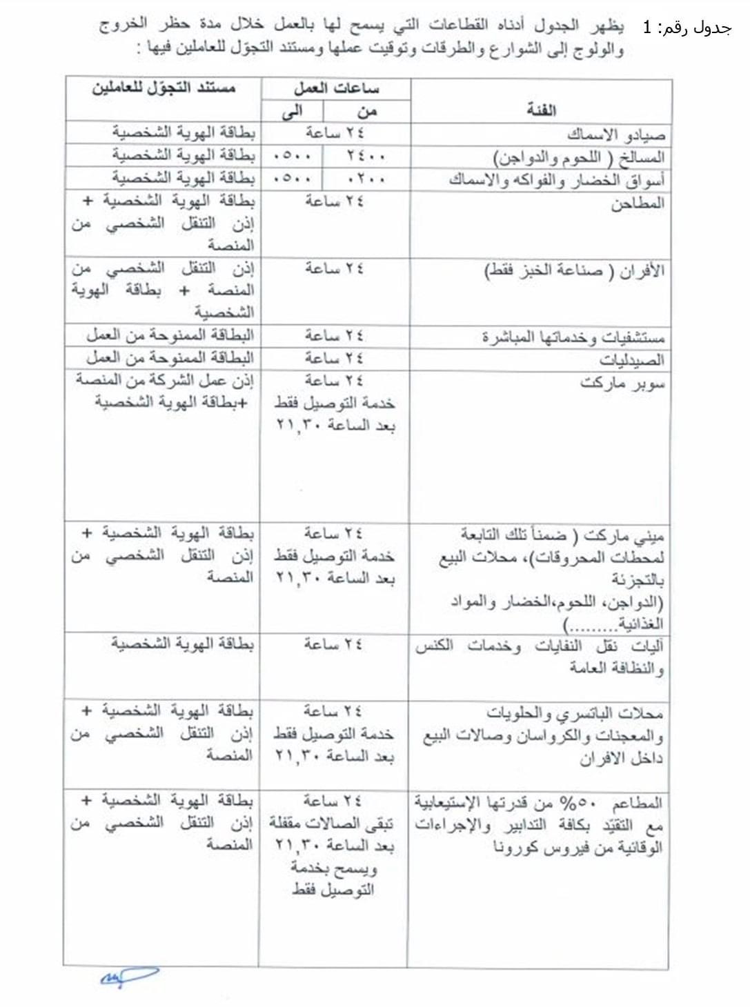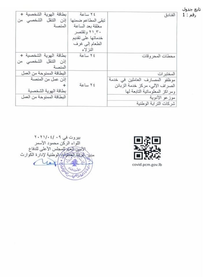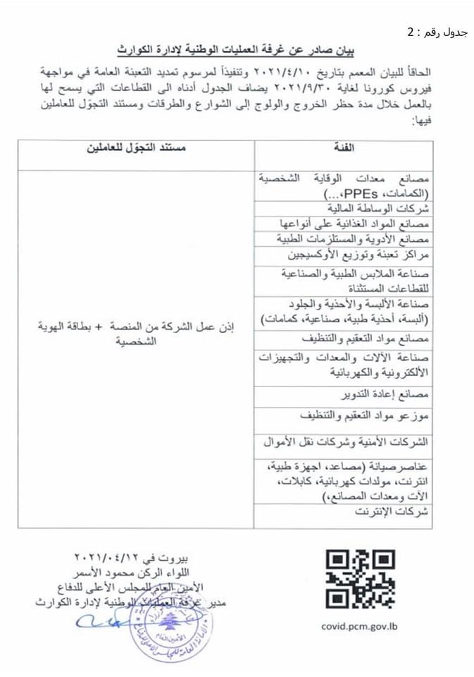 صدر عن المديرية العامة لقوى الأمن الداخلي – شعبة العلاقات العامة البلاغ الآتي: “تطبيقا للقرار الصادر عن غرفة العمليات الوطنية لإدارة الكوارث، الذي يقضي بمنع الخروج والولوج إلى الشوارع والطرق ما بين الساعة 21:30 والساعة 5:00 من فجر اليوم التالي، وذلك لمدة شهر، ابتداء من الاثنين 12-4-2021، ما عدا القطاعات المذكورة في الجدولين المرفقين ربطا، والتي يسمح لها بالعمل خلال هذه المدة، ومن أجل الحفاظ على السلامة العامة والحد من خطر انتشار وباء كورونا، ستقوم قطعات قوى الأمن الداخلي بالتشدد في تنفيذ مضمون هذا القرار الذي ينص على ما يلي: