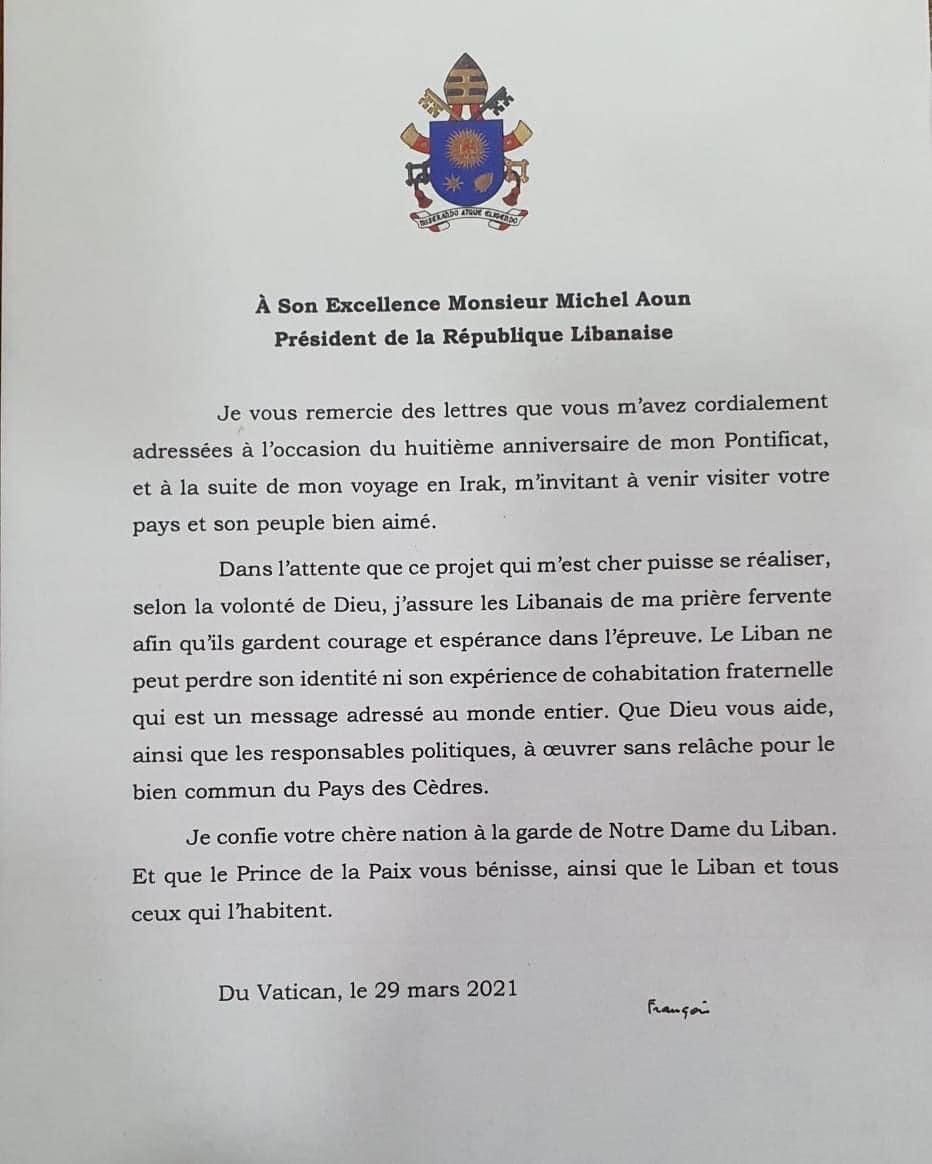 كلام البابا فرنسيس، جاء في خلال رسالة الى رئيس الجمهورية العماد ميشال عون شكره فيها على كتاب تهنئته لمناسبة السنة الثامنة لحبريته، والرسالة التي بعث بها الرئيس عون اليه على اثر زيارته للعراق والتي تضمنت دعوة رسمية للاب الاقدس لزيارة لبنان.
