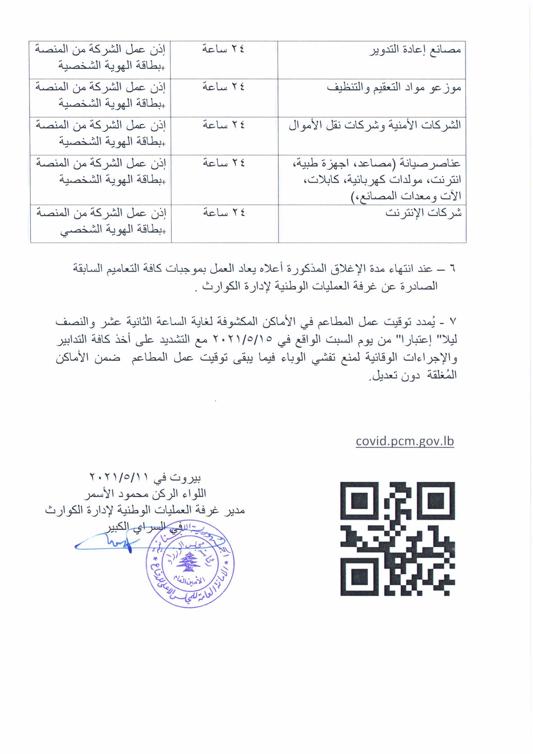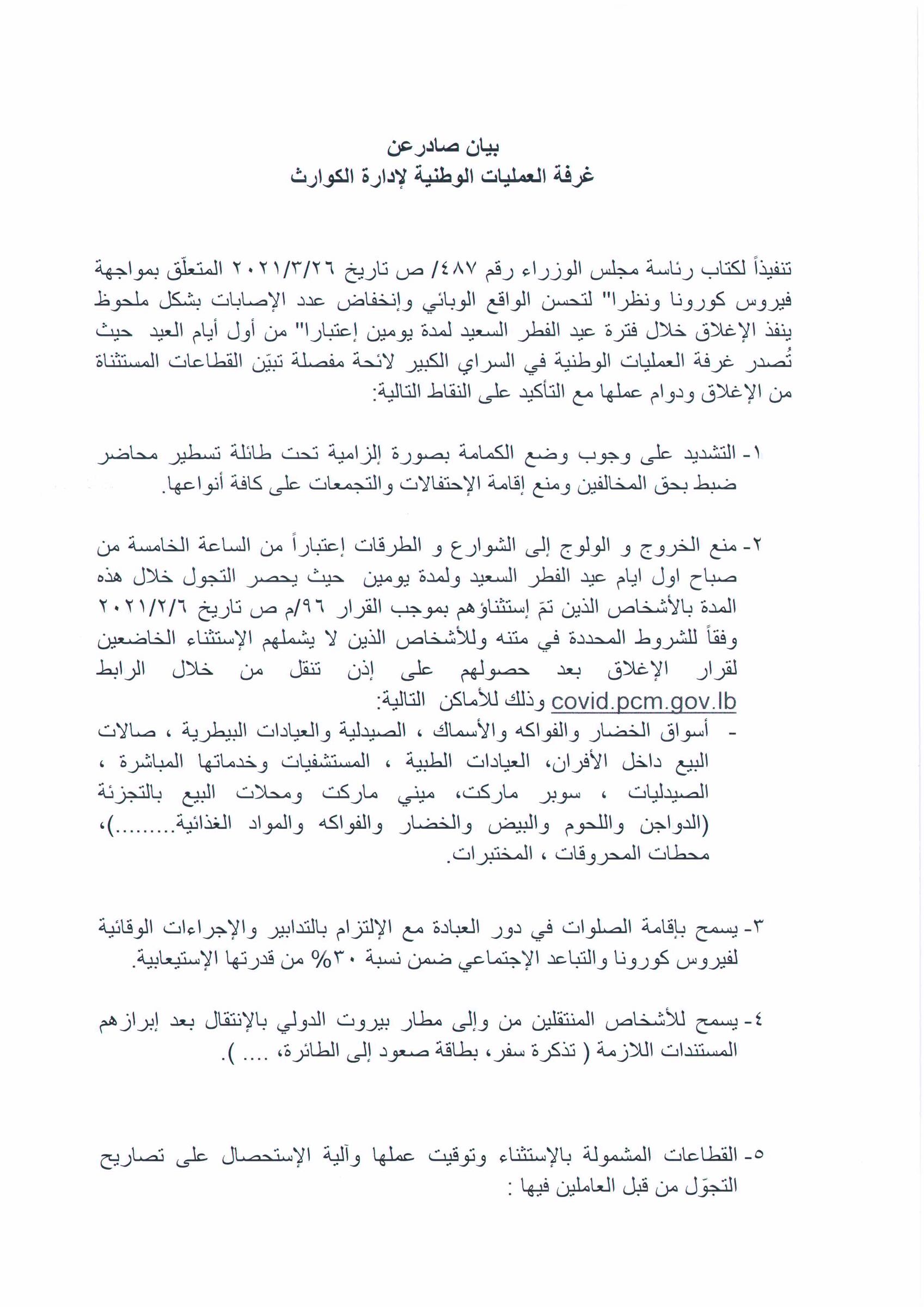 محلياتهذه هي مدّة الاقفال خلال فترة عيد الفطر.. وما هي القطاعات المستثناة؟ محلياتهذه هي مدّة الاقفال خلال فترة عيد الفطر.. وما هي القطاعات المستثناة؟17:40 2021 ,May 1101169 أعلنت غرفة العمليات الوطنية لإدارة الكوارث أنّه ونظراً لتحسّن الواقع الوبائي وانخفاض عدد الإصابات، يُنفّذ الإغلاق خلال فترة عيد الفطر السعيد لمدّة يومين اعتباراً من أول أيام العيد. FacebookTwitterPinterestWhatsAppTelegram الخبر السابقبالتفاصيل – اجتماع سرّي لنائبين في جبيل مع الناشط العوني المنشقالخبر التاليهذا ما قاله الراعي عن ما تشهده أرض فلسطين المحتلة- إعلان - - إعلان - ترك الردالتعليق:من فضلك ادخل تعليقك اسم:*من فضلك ادخل اسمك هنا البريد الإلكتروني:*لقد أدخلت عنوان بريد إلكتروني غير صحيح!الرجاء إدخال عنوان بريدك الإلكتروني هنا الموقع: احفظ اسمي والبريد الإلكتروني وموقع الويب في هذا المتصفح للمرة الأولى التي أعلق فيها. - إعلانات - - إعلانات - الأكثر قراءةحزب يحسم تحالفه مع نائب في كسروان- جبيل 14:18 2025 ,December 12 الموت يُغيّب ممثلة شهيرة عن 45 عاماً! (صورة) 16:11 2025 ,December 15 بالصور – في أدونيس: اشتباك عنيف بين متحولين جنسياً .. وسقوط من المبنى! 17:53 2025 ,December 13 خاص-سرقة منزل في عمشيت 11:37 2025 ,December 17 المزيد- إعلانات - - إعلانات - - إعلان - - إعلان -