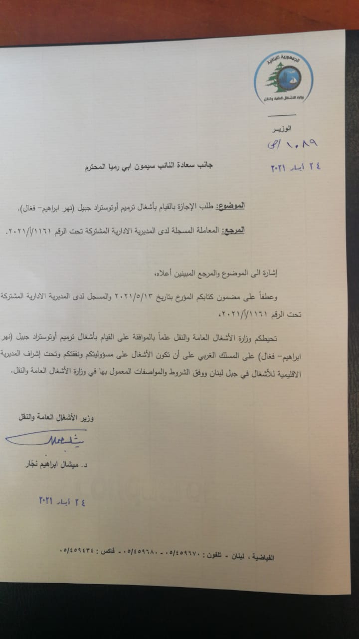 وافقت وزارة الأشغال العامة النقل على طلب النائب سيمون ابي رميا الاجازة بالقيام باشغال ترميم اوتوستراد جبيل(نهر ابراهيم_فغال) ، وذلك عطفا على مضمون كتاب ابي رميا رقم ١١٦١/أ/٢٠٢١ بتاريخ ١٣ أيار ٢٠٢١، وقد جاء في البيان: