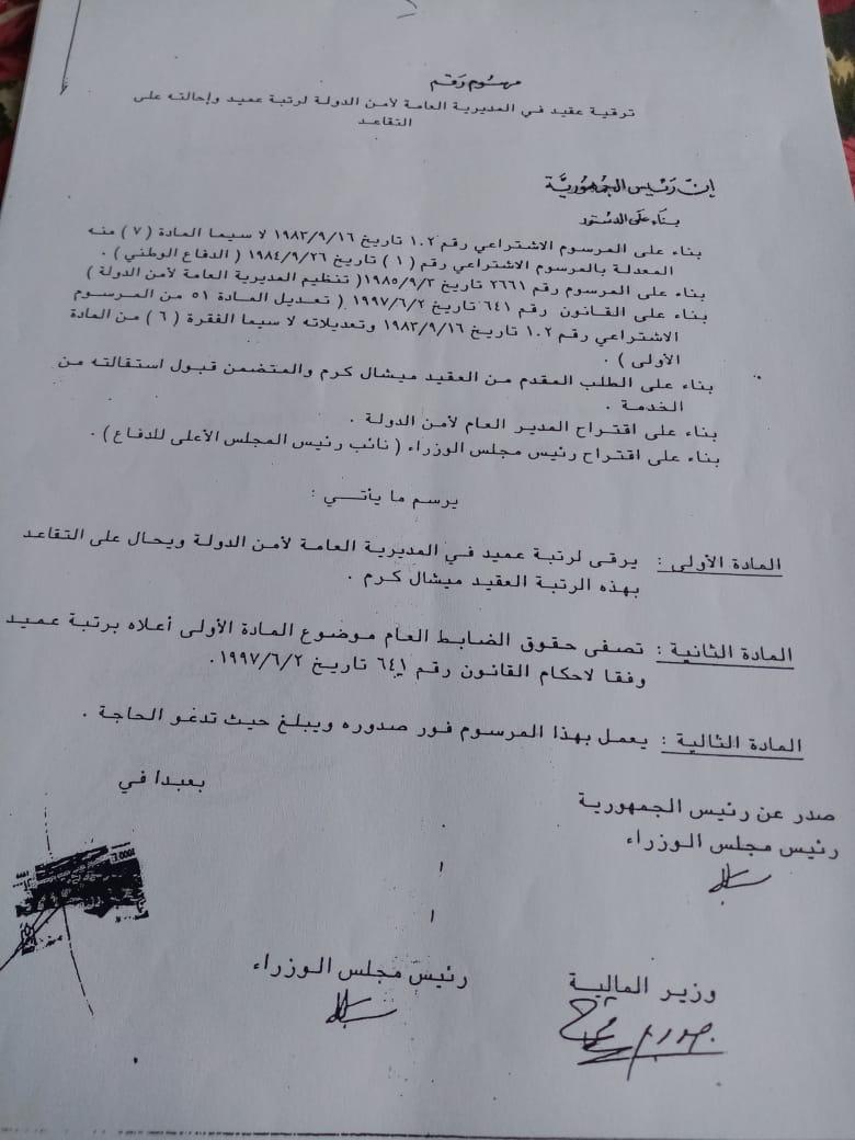 تبين ان تأخير ترقية العميد ميشال كرم (والد الزميلة الاعلامية راشيل كرم) عام ٢٠٠٠، سببه تدخلات سياسية وضغوط من القيادة السورية لمصلحة النائبة السابقة نهاد سعيد التي طالبت الرئيس اميل لحود في حينها، عدم قبول استقالة كرم بغية حرمانه من الترشح للانتخابات النيابية في مواجهة نجلها النائب السابق فارس سعيد.