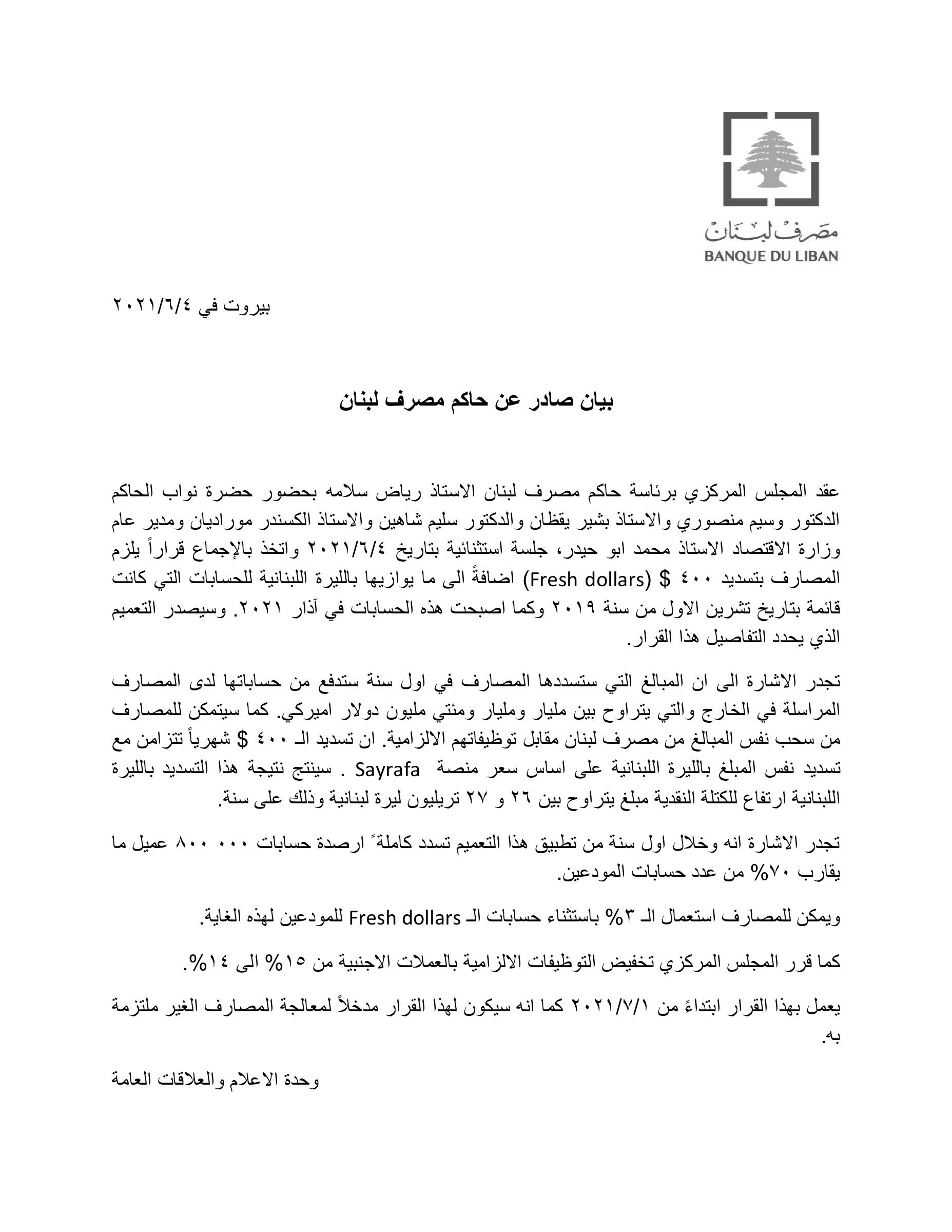 عقد المجلس المركزي برئاسة حاكم مصرف لبنان رياض سلامة جلسة استثنائية واتخذ بالاجماع قراراً يلزم المصارف بتسديد 400 دولار (fresh dollars) اضافة الى ما يوازيها بالليرة اللبنانية للحسابات التي كانت قائمة بتاريخ تشرين الأول من سنة 2019 وكما اصبحت هذه الحسابات في أذار 2021.