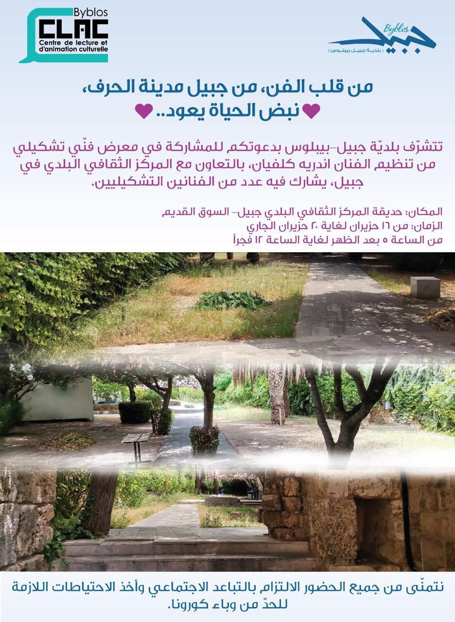 تدعوكم بلدية جبيل-بيبلوس لزيارة في معرض فني تشكيلي من تنظيم الفنان اندريه كلفيان، بالتعاون مع المركز الثقافي البلدي في جبيل، يشارك فيه عدد كبير من الفنانين التشكيليين.