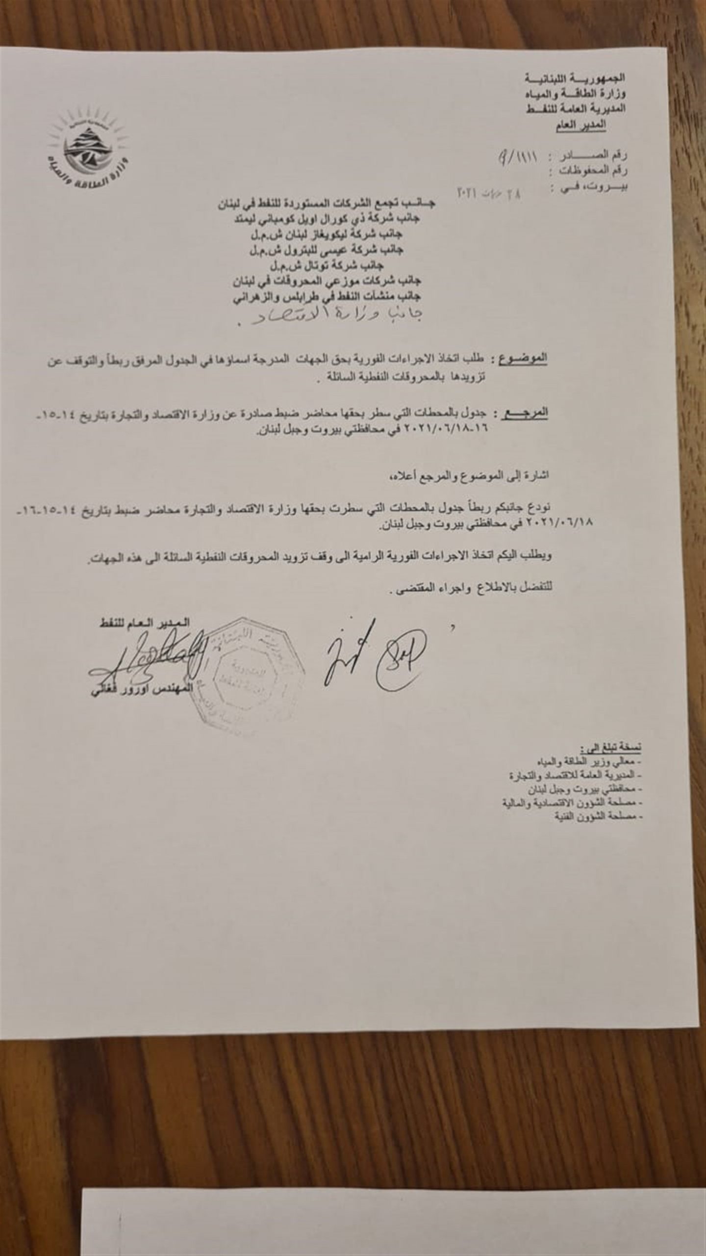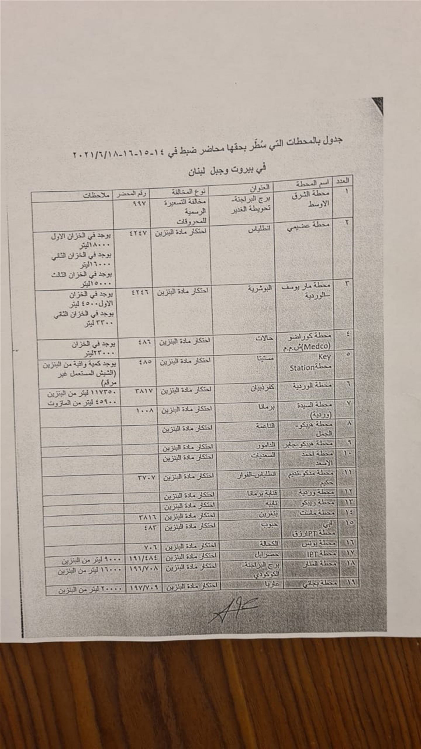 الجدول أدناه يظهر أسماء المحطات التي سطّر بها محاضر ضبط وصادر عن وزارة الاقتصاد والتجارة في محافظتي بيروت وجبل لبنان.