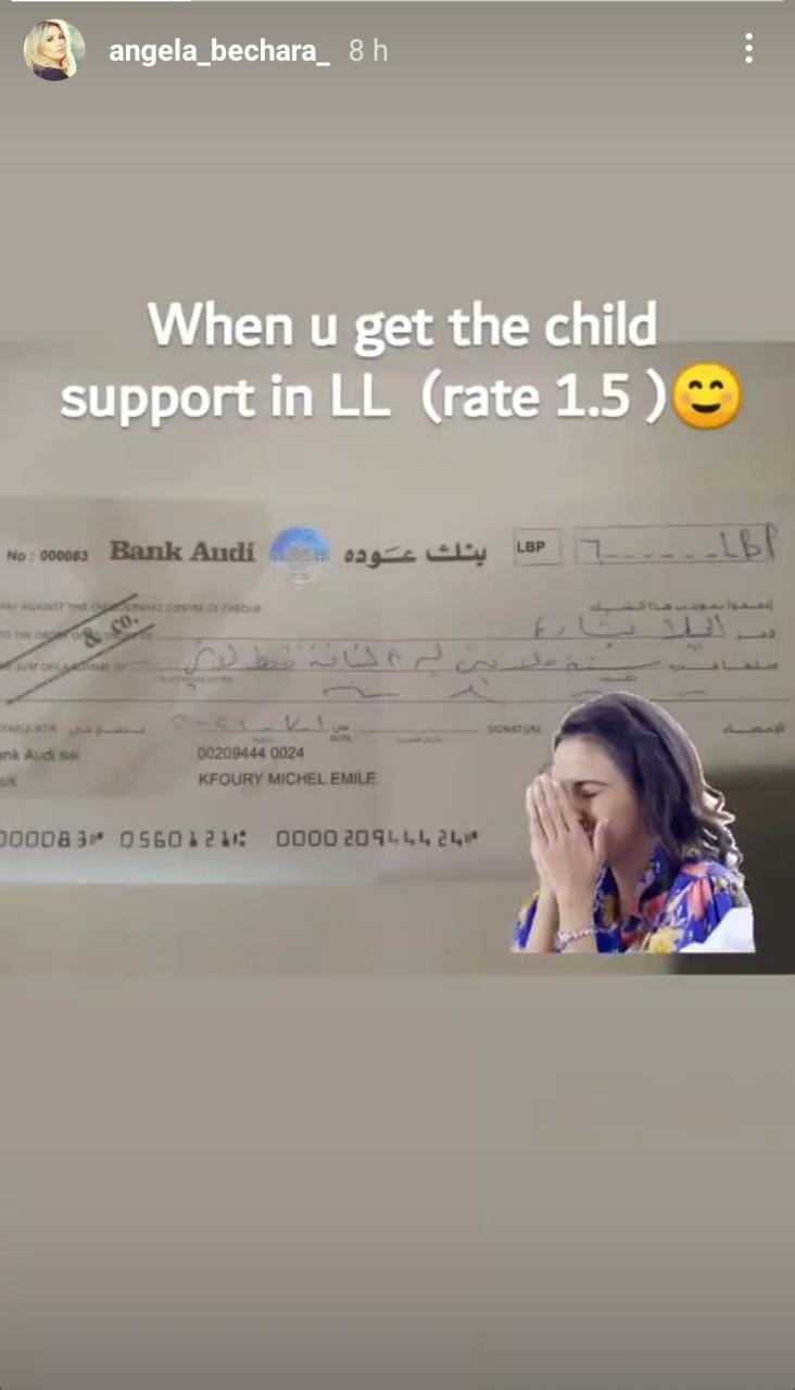 وقد وضعت صورة الشيك بقيمة ٦ ملايين ليرة لبنانية على خاصية الستوري عبر صفحتها الخاصة على إنستغرام، وعلّقت بسخرية قائلةً: ” عندما تريد أن تربّي أطفالك بالليرة اللبنانية”.