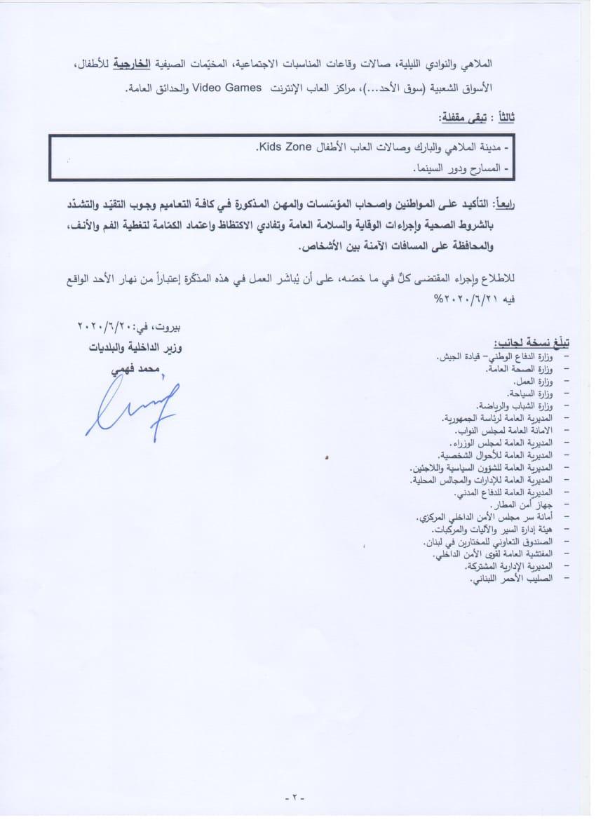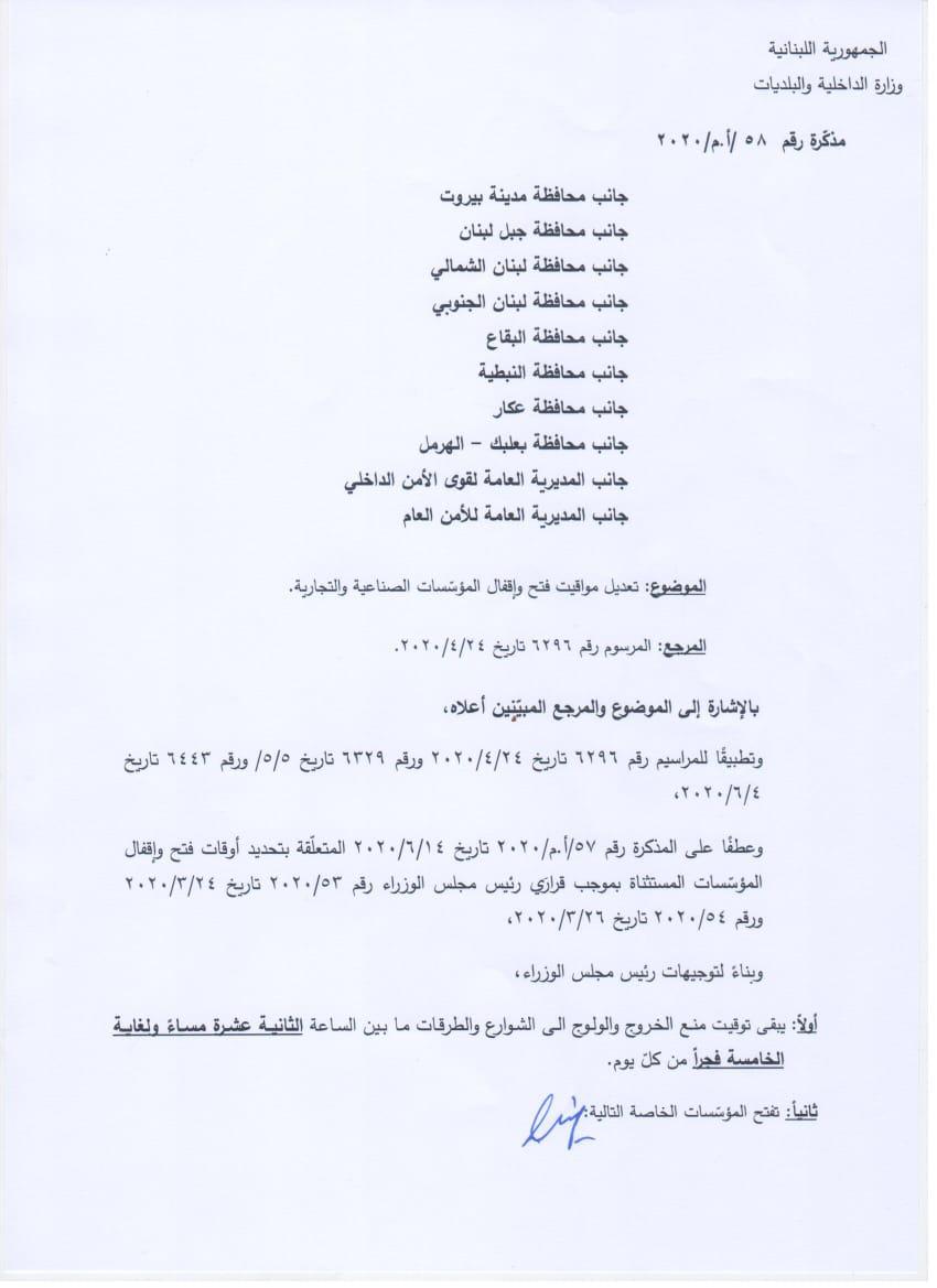 محلياتتعديل بمواقت فتح واقفال المؤسسات الصناعية والتجارية : الملاهي والنوادي الليلية ستفتح... محلياتتعديل بمواقت فتح واقفال المؤسسات الصناعية والتجارية : الملاهي والنوادي الليلية ستفتح…17:03 2020 ,June 200327 اصدرت وزارة الداخلية قراراً بتعديل مواقيت فتح واقفال المؤسسات الصناعية والتجارية. وابقت فيه على مواقيت منع الخروج والولوج إلى الشوارع والطرقات وهي بين الـ12 مساء ولغاية الخامسة فجراً. FacebookTwitterPinterestWhatsAppTelegram الخبر السابقالدكتور جيلبير المجبر: المطلوب تأسيس نظام جديد للجمهوريةالخبر التاليقرار لمحافظ جبل لبنان بعزل حي في الغبيري- إعلان - - إعلان - ترك الردالتعليق:من فضلك ادخل تعليقك اسم:*من فضلك ادخل اسمك هنا البريد الإلكتروني:*لقد أدخلت عنوان بريد إلكتروني غير صحيح!الرجاء إدخال عنوان بريدك الإلكتروني هنا الموقع: احفظ اسمي والبريد الإلكتروني وموقع الويب في هذا المتصفح للمرة الأولى التي أعلق فيها. - إعلانات - - إعلانات - الأكثر قراءةحزب يحسم تحالفه مع نائب في كسروان- جبيل 14:18 2025 ,December 12 بالصور – في أدونيس: اشتباك عنيف بين متحولين جنسياً .. وسقوط من المبنى! 17:53 2025 ,December 13 الموت يُغيّب ممثلة شهيرة عن 45 عاماً! (صورة) 16:11 2025 ,December 15 إعلامية لبنانية تنهار بالبكاء خلال برنامجها.. ما الذي حصل معها! 14:32 2025 ,December 12 المزيد- إعلانات - - إعلانات - - إعلان - - إعلان -