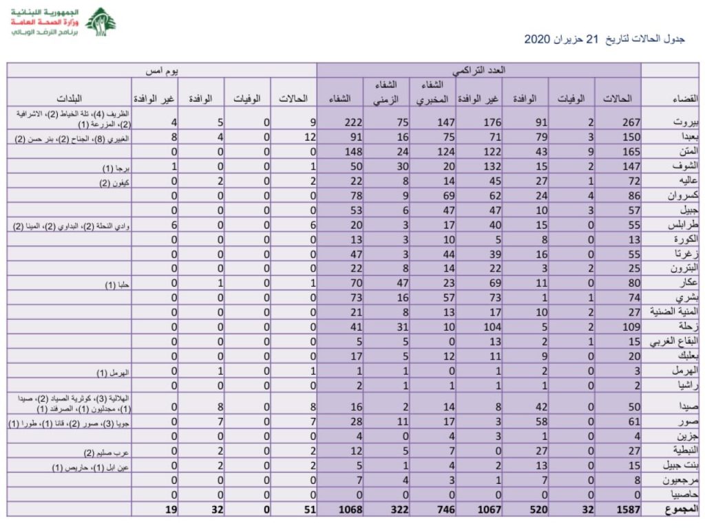محلياتصحّةارتفاع كبير بعدد المصابين بفيروس كورونا في لبنان... 51 اصابة جديدة صحّةارتفاع كبير بعدد المصابين بفيروس كورونا في لبنان… 51 اصابة جديدة16:39 2020 ,June 210774 اعلنت وزارة الصحة عن تسجيل 51 جديدة بفيروس كورونا في لبنان رفعت الاجمالي الى 1587. FacebookTwitterPinterestWhatsAppTelegram الخبر السابقبالصور- 11 شخصاً من مثيري الشغب في وسط بيروت في قبضة شعبة المعلوماتالخبر التاليالسائق بول القصيفي أولاً في الجولة الثانية لسباق speed test- إعلان - - إعلان - ترك الردالتعليق:من فضلك ادخل تعليقك اسم:*من فضلك ادخل اسمك هنا البريد الإلكتروني:*لقد أدخلت عنوان بريد إلكتروني غير صحيح!الرجاء إدخال عنوان بريدك الإلكتروني هنا الموقع: احفظ اسمي والبريد الإلكتروني وموقع الويب في هذا المتصفح للمرة الأولى التي أعلق فيها. - إعلانات - - إعلانات - الأكثر قراءةمأساة مؤلمة… ميشال جثّة داخل منزله! 11:38 2025 ,December 4 أوَّل معجزة تُسَجَّل بعد زيارة البابا ضريح مار شربل: رَنَّ هاتف الطبيب وصوتُ القديس يُعلِنُ الأعجوبة 15:24 2025 ,December 4 حادث مؤسف يطال النائب افرام قبيل زيارة الحبر الأعظم… فهل يشارك؟ 19:41 2025 ,November 29 جريمة مروّعة نفّذها سوريّان… ودعوات لضبط النفس 12:02 2025 ,December 4 المزيد- إعلانات - - إعلانات - - إعلان - - إعلان -