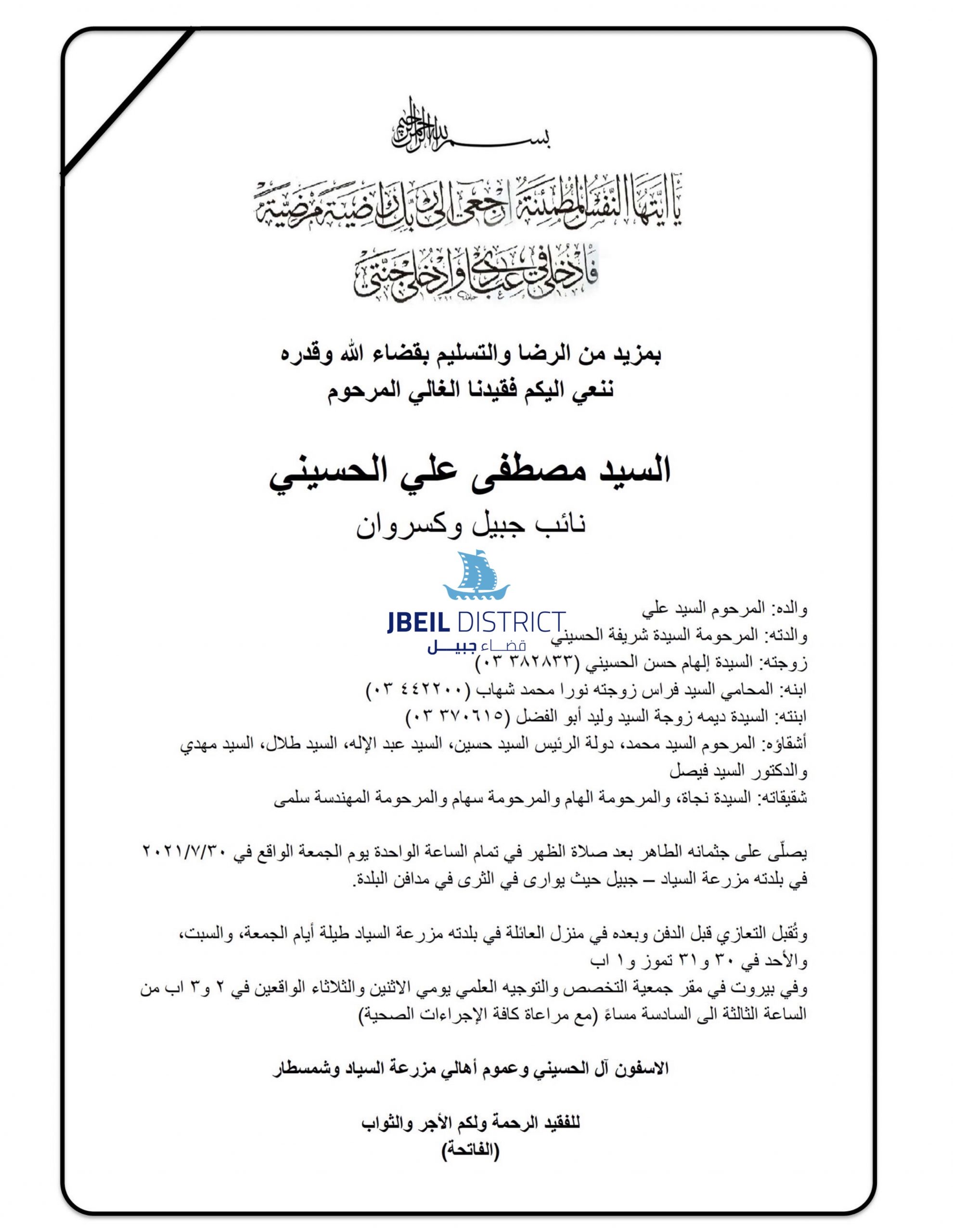 وسيصلّى على جثمانه بعد صلاة الظهر في تمام الساعة الواحدة يوم الجمعة الواقع ٢٠٢١/٧/٣٠ في بلدته مزرعة السياد قضاء جبيل حيث يوارى في الثرى في مدافن البلدة.