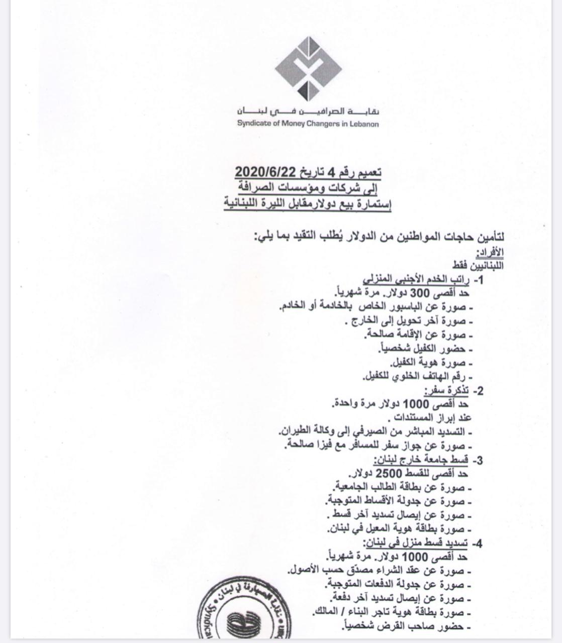 إقتصادتعميم من نقابة الصرافين الى مؤسسات الصيرفة بشأن بيع الدولار إقتصادتعميم من نقابة الصرافين الى مؤسسات الصيرفة بشأن بيع الدولار11:58 2020 ,June 220468 أصدرت نقابة الصرافين تعميمًا الى شركات ومؤسسات الصيرفة حول استمارة بيع دولار مقابل الليرة اللبنانية. FacebookTwitterPinterestWhatsAppTelegram الخبر السابقسعيد: عندما رفضت التسوية الرئاسية دفعت الثمن واليوم الجميع استفاقواالخبر التاليألفا أعادت فتح متجريها في الدكوانة وجبيل- إعلان - - إعلان - ترك الردالتعليق:من فضلك ادخل تعليقك اسم:*من فضلك ادخل اسمك هنا البريد الإلكتروني:*لقد أدخلت عنوان بريد إلكتروني غير صحيح!الرجاء إدخال عنوان بريدك الإلكتروني هنا الموقع: احفظ اسمي والبريد الإلكتروني وموقع الويب في هذا المتصفح للمرة الأولى التي أعلق فيها. - إعلانات - - إعلانات - الأكثر قراءةمأساة مؤلمة… ميشال جثّة داخل منزله! 11:38 2025 ,December 4 أوَّل معجزة تُسَجَّل بعد زيارة البابا ضريح مار شربل: رَنَّ هاتف الطبيب وصوتُ القديس يُعلِنُ الأعجوبة 15:24 2025 ,December 4 حادث مؤسف يطال النائب افرام قبيل زيارة الحبر الأعظم… فهل يشارك؟ 19:41 2025 ,November 29 جريمة مروّعة نفّذها سوريّان… ودعوات لضبط النفس 12:02 2025 ,December 4 المزيد- إعلانات - - إعلانات - - إعلان - - إعلان -