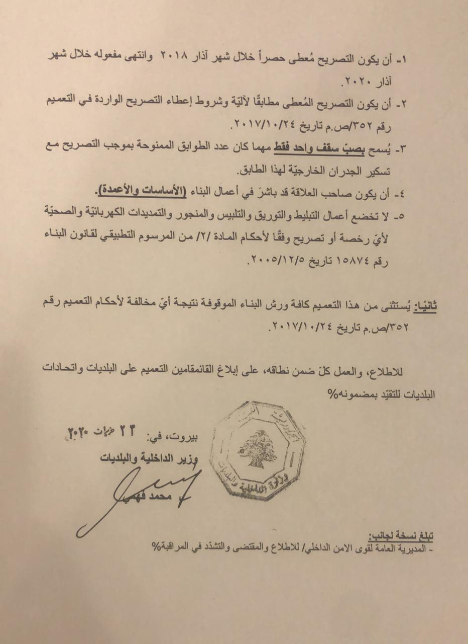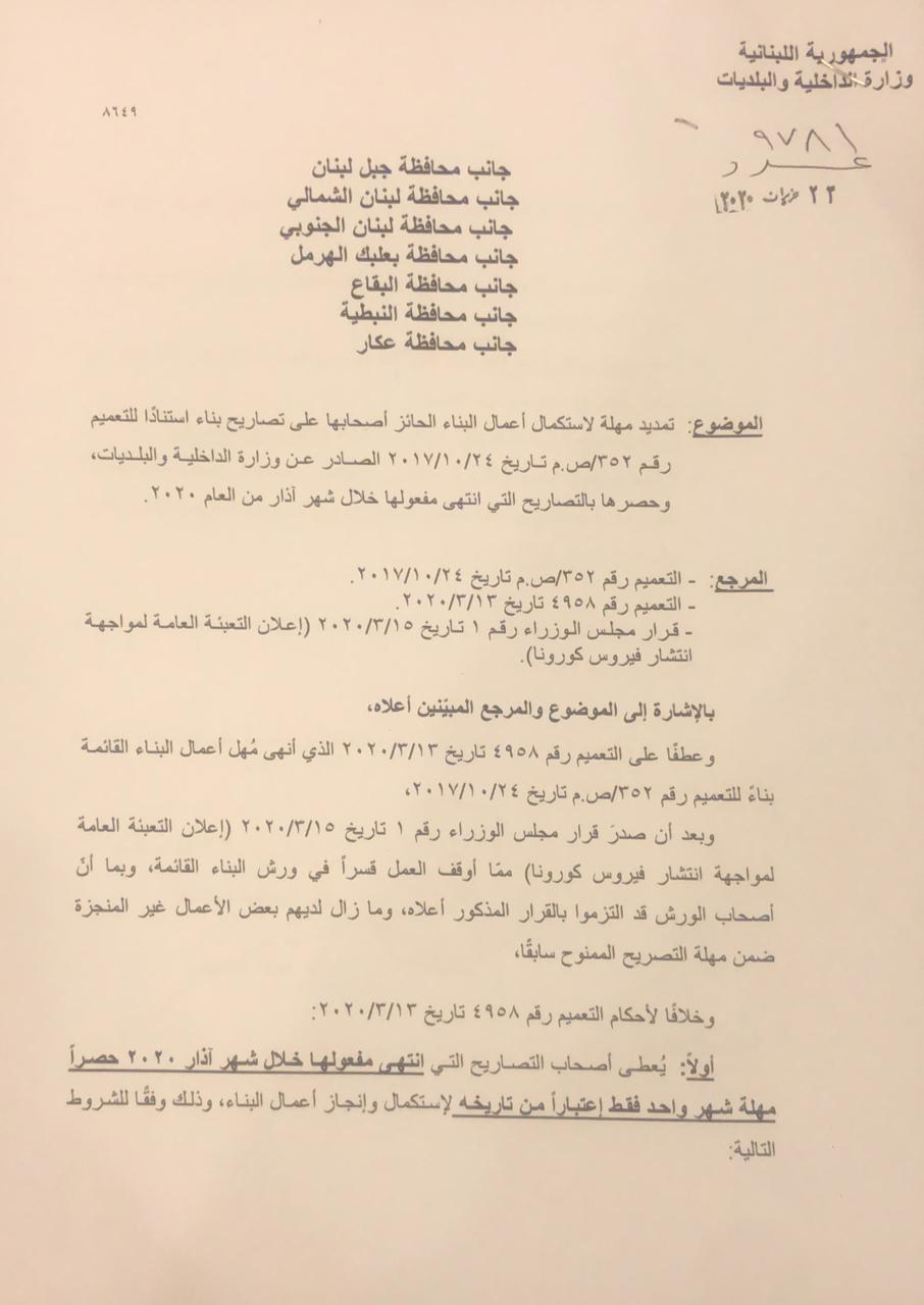 أبرز العناوينبالوثيقة : تعميم من الداخلية لاستكمال اعمال البناء. محلياتبالوثيقة : تعميم من الداخلية لاستكمال اعمال البناء.17:08 2020 ,June 230604 اصدر وزير الداخلية والبلديات محمد فهمي قراراً بتمديد مهلة لاستكمال اعمال البناء الحائز اصحابها على تصاريح بناء استناداً للتعميم رقم 352/ص.م تاريخ 24/10/2020 الصادر عن وزارة اللداخلية وحصرها بالتصاريح التي انتهى مفعولها خلال شهر آذار من العام 2020. FacebookTwitterPinterestWhatsAppTelegram الخبر السابقجولة لوزير الصحة غداً في جبيلالخبر التاليقائد الجيش حضر مناورة لتلامذة ضباط في جرد العاقورة: النجاح هو ثمرة كل عمل دؤوب يشترك فيه الجميع- إعلان - - إعلان - ترك الردالتعليق:من فضلك ادخل تعليقك اسم:*من فضلك ادخل اسمك هنا البريد الإلكتروني:*لقد أدخلت عنوان بريد إلكتروني غير صحيح!الرجاء إدخال عنوان بريدك الإلكتروني هنا الموقع: احفظ اسمي والبريد الإلكتروني وموقع الويب في هذا المتصفح للمرة الأولى التي أعلق فيها. - إعلانات - - إعلانات - الأكثر قراءةمأساة مؤلمة… ميشال جثّة داخل منزله! 11:38 2025 ,December 4 أوَّل معجزة تُسَجَّل بعد زيارة البابا ضريح مار شربل: رَنَّ هاتف الطبيب وصوتُ القديس يُعلِنُ الأعجوبة 15:24 2025 ,December 4 حادث مؤسف يطال النائب افرام قبيل زيارة الحبر الأعظم… فهل يشارك؟ 19:41 2025 ,November 29 جريمة مروّعة نفّذها سوريّان… ودعوات لضبط النفس 12:02 2025 ,December 4 المزيد- إعلانات - - إعلانات - - إعلان - - إعلان -