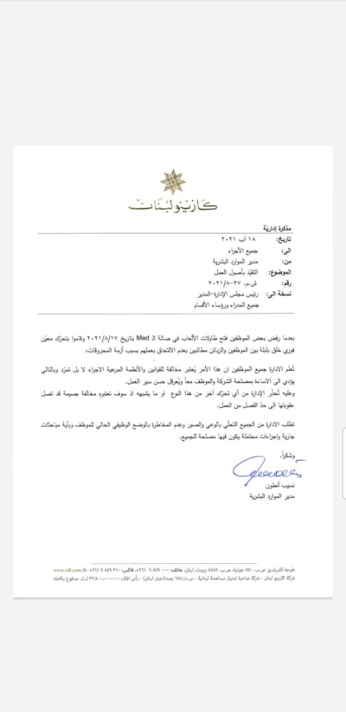 وعليه تحذر الإدارة من أي تحرك اخر من هذا النوع أو ما يشبهه والإّ سوف نعتبره مخلفة جسيمة قد تصل عقوبتها الى حد الفصل من العمل.