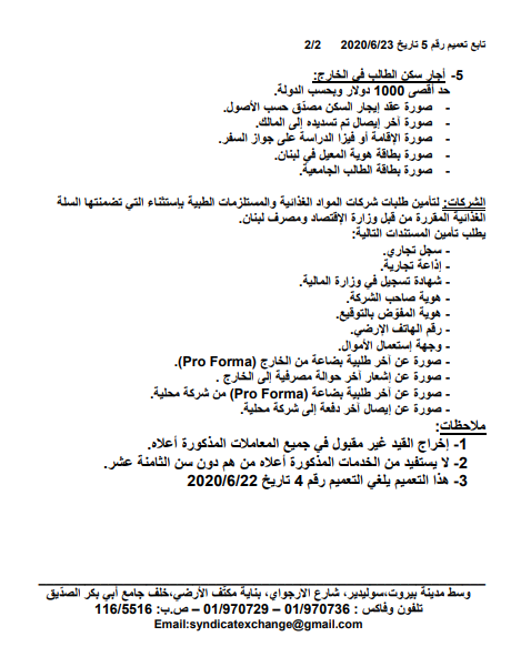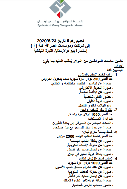 إقتصادتعميم نقابة الصرافين الجديد لشراء الدولار إقتصادتعميم نقابة الصرافين الجديد لشراء الدولار09:42 2020 ,June 240337 أصدرت نقابة الصرافين في لبنان تعميماً جديداً، يحمل الرقم 5، إلى شركات ومؤسسات الصرافة فئة (أ) حول إستمارة بيع الدولار مقابل الليرة اللبنانية.وقد أعلنت النقابة من خلال التعميم عن سلسلة تدابير يجب التقيّد بها لتأمين حاجات المواطنين من الدولار. FacebookTwitterPinterestWhatsAppTelegram الخبر السابقسعر صرف الدولار مقابل الليرةالخبر التاليارتفاع بسعر المازوت والغاز- إعلان - - إعلان - ترك الردالتعليق:من فضلك ادخل تعليقك اسم:*من فضلك ادخل اسمك هنا البريد الإلكتروني:*لقد أدخلت عنوان بريد إلكتروني غير صحيح!الرجاء إدخال عنوان بريدك الإلكتروني هنا الموقع: احفظ اسمي والبريد الإلكتروني وموقع الويب في هذا المتصفح للمرة الأولى التي أعلق فيها. - إعلانات - - إعلانات - الأكثر قراءةحادث مؤسف يطال النائب افرام قبيل زيارة الحبر الأعظم… فهل يشارك؟ 19:41 2025 ,November 29 أوَّل معجزة تُسَجَّل بعد زيارة البابا ضريح مار شربل: رَنَّ هاتف الطبيب وصوتُ القديس يُعلِنُ الأعجوبة 15:24 2025 ,December 4 مأساة مؤلمة… ميشال جثّة داخل منزله! 11:38 2025 ,December 4 إعلامي لبناني شهير يحتفل بخطوبته.. شاهدوا الصور والفيديو 10:31 2025 ,November 29 المزيد- إعلانات - - إعلانات - - إعلان - - إعلان -