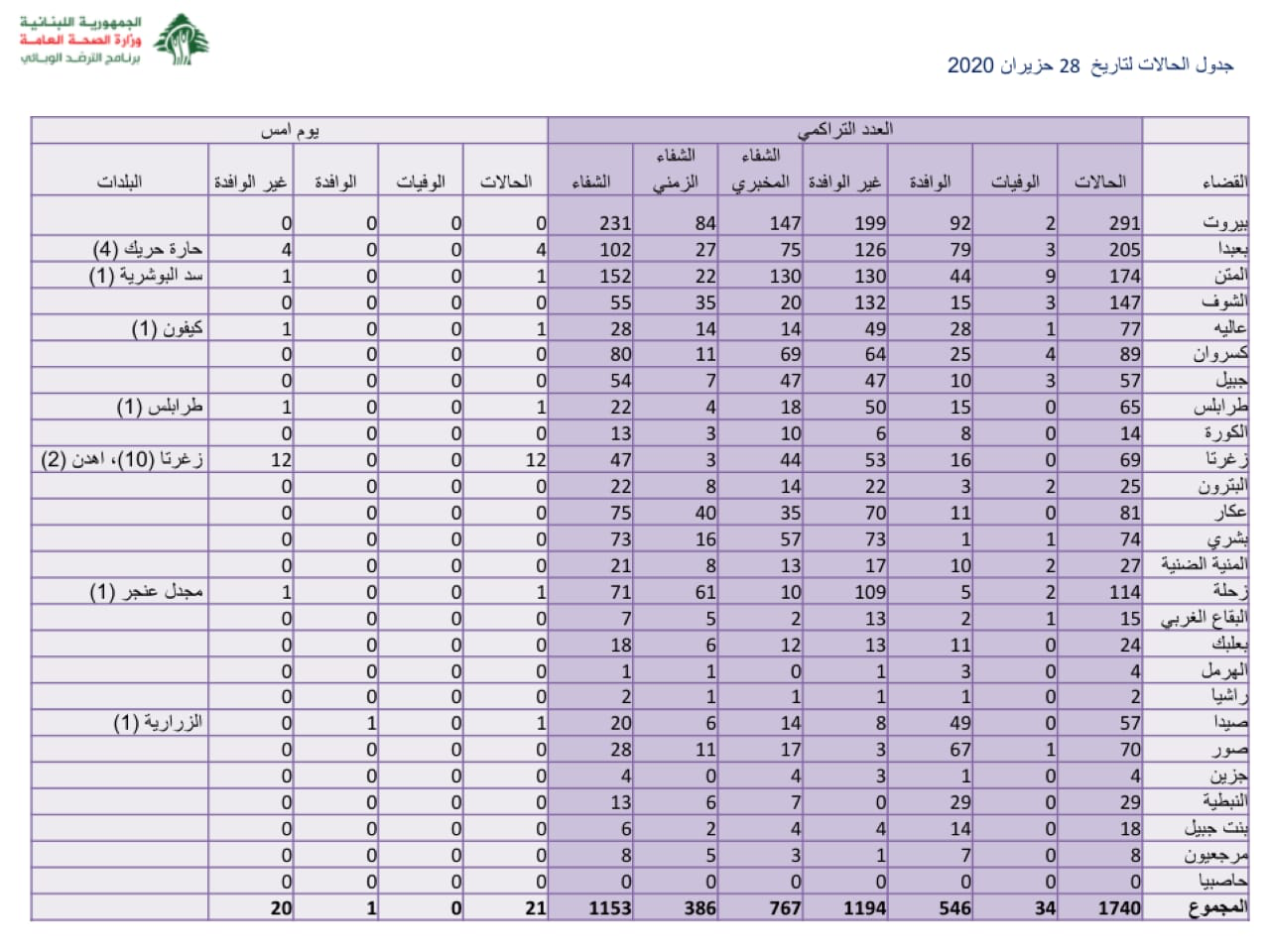 محلياتصحّةوزارة الصحة: 21 إصابة جديدة صحّةوزارة الصحة: 21 إصابة جديدة15:09 2020 ,June 280321 اعلنت وزارة الصحة العامة تسجيل 21 إصابة كورونا جديدة رفعت العدد التراكمي للحالات المثبتة الى 1740. FacebookTwitterPinterestWhatsAppTelegram الخبر السابقالحريات العامة ضمانة للاستقرارالخبر التاليالدكتور المجبر: مواقفنا انسجمت مع خطبة البطريرك الراعي .. لا نحتاج اجتماعات فارغة!- إعلان - - إعلان - ترك الردالتعليق:من فضلك ادخل تعليقك اسم:*من فضلك ادخل اسمك هنا البريد الإلكتروني:*لقد أدخلت عنوان بريد إلكتروني غير صحيح!الرجاء إدخال عنوان بريدك الإلكتروني هنا الموقع: احفظ اسمي والبريد الإلكتروني وموقع الويب في هذا المتصفح للمرة الأولى التي أعلق فيها. - إعلانات - - إعلانات - الأكثر قراءةحادث مؤسف يطال النائب افرام قبيل زيارة الحبر الأعظم… فهل يشارك؟ 19:41 2025 ,November 29 أوَّل معجزة تُسَجَّل بعد زيارة البابا ضريح مار شربل: رَنَّ هاتف الطبيب وصوتُ القديس يُعلِنُ الأعجوبة 15:24 2025 ,December 4 مأساة مؤلمة… ميشال جثّة داخل منزله! 11:38 2025 ,December 4 إعلامي لبناني شهير يحتفل بخطوبته.. شاهدوا الصور والفيديو 10:31 2025 ,November 29 المزيد- إعلانات - - إعلانات - - إعلان - - إعلان -