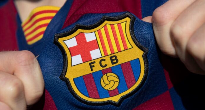MANCHESTER, ENGLAND - MARCH 07: Displaying the FC Barcelona club crest on the first team home shirt on March 7, 2021 in Manchester, United Kingdom. (Photo by Visionhaus/Getty Images)