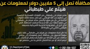 وقالت الخارجية الأميركية إن “هيثم علي طبطبائي هو قائد عسكري في تنظيم حزب الله ساعد على زعزعة استقرار المنطقة. إذا كانت لديك معلومات عنه، فقد تحصل على مكافأة تصل الى 5 ملايين دولار”