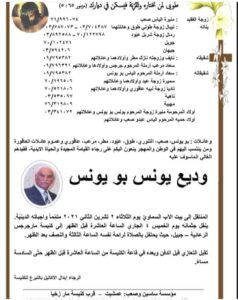 وأضافت، تقبل التعازي بوديع بو يونس نهار الاربعاء ٣ تشرين الثاني من الساعة12 حتى الخامسة بعد الظهر ونهار الدفن الخميس 4 تشرين الثاني (الساعة 3:30) من الساعة العاشرة صباحا حتى السادسة مساء”