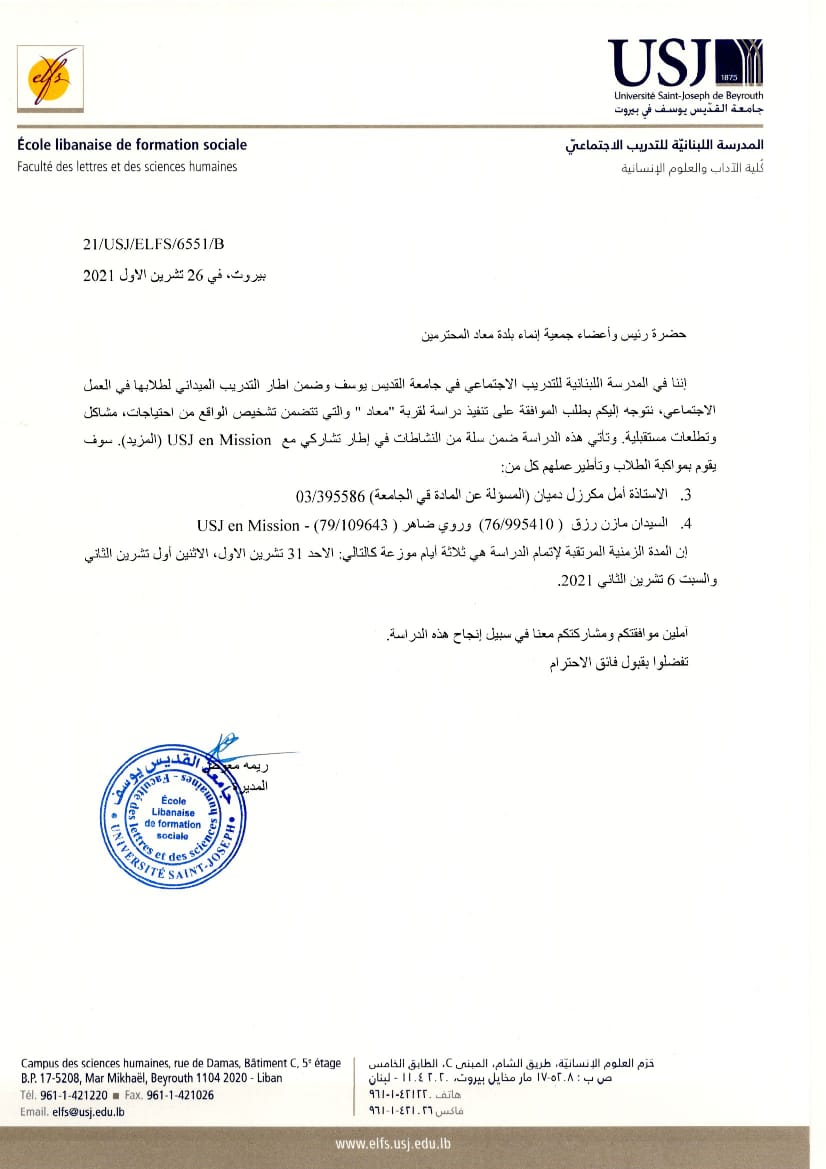 استقبلت بلدة معاد في قضاء جبيل مجموعة من طلاب المدرسة اللبنانية للتدريب الاجتماعي في جامعة القديس يوسف بالتعاون مع USJ en mission وبالتنسيق مع جمعية إنماء بلدة معاد بشخص رئيسها طوني نصار وذلك بهدف القيام بدراسة في البلدة لناحية تشخيص الواقع من احتياجات وتطلعات مستقبلية حيث جالوا على أهالي وفعليات البلدة لجمع كافة المعلومات .
